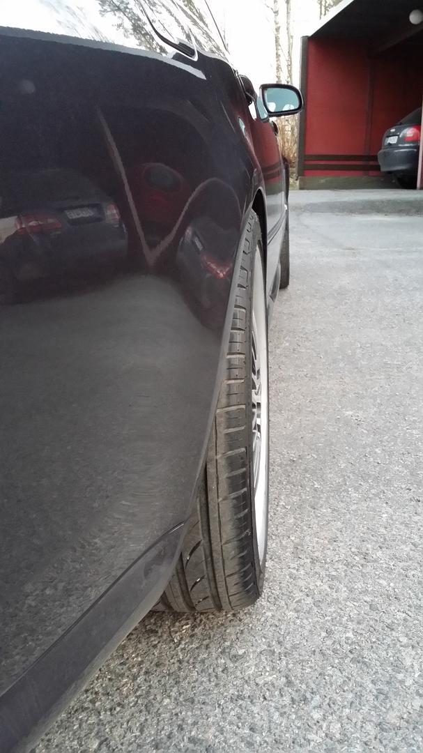 En nyt oo lähtötilannetta madallukselle nähny mutta onhan tossa varaa pudottaa. Itellä ku laittelin kesäset alle nii hyvä ettei kulutuspinta ollu lokarin ulkopuolella. Auto alas nosturilta nii just eikä melkeen omaan silmään asettu rengas. Se yllättävän paljon sukeltaa sisälle päin ja silmä ku tuppaa näissä hommissa valehtelevan monesti.. ite laittelisin auton oikeaan korkeuteen ennen ku alkasin manaamaan. :)