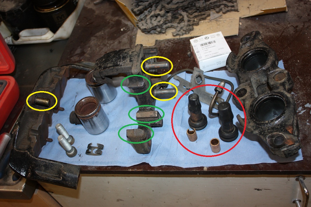 [COLOR="Lime"]Vihreä:[/COLOR] Jarrupalojen liukupinnat, mitä liukkaammat sitä parempi. Teräsharjalla puhtaaksi ja vaikka hienolla viilalla suoraksi jos on hapettumia/kolhuja.