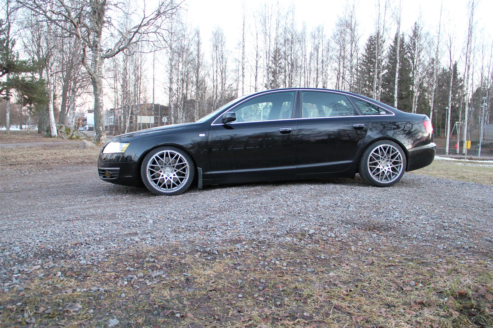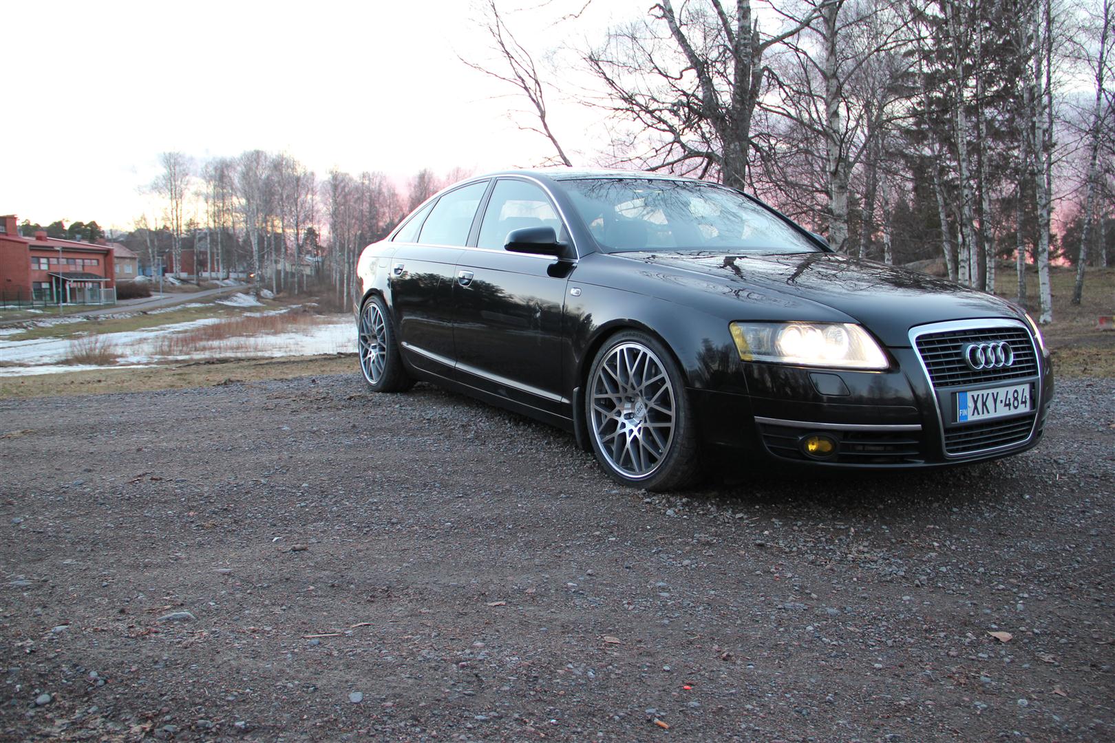 A6 4F, alla kaikissa kulmissa Continental Sport Contact 5 koossa 255/ 35 ZR 19. Paineet normaalisti noin 3.0 bar. Toimii mukavasti taas talvigummien jälkeen jotka ovat Continental Ice Contactit koossa 225/55 R16. Kummassakin tapauksessa Audin orkkisvanteet. Ja siis tietenkään mahtumisten kanssa ei ole mitään ongelmia. Mutta mutta, rehellisyyden nimissä on sanottava, että mukavuus on jopa noilla talvigummeilla parempi kuin noilla kesäisillä. Leveä ja matalaprofiilinen rengas tekee seuraavaa: ohjaus hakee helposti ja ei pysy suunnassaan, voimaa täytyy käyttää enemmän ohjaamiseen, epätasaisuudet tuntuvat epämukavuutena ja täyssyihin ajossa pelkään rikkovani alustan joten aina kunnolla vauhdit pois kun on epätsaisuuksia. Uraisilla teillä renkaat tuppaavat ohjautumaan uran reunaa ylöspäin. Pelkäänpä myös että alustan osat kuluvat nopeammin kuin vakiorengastuksella koska osa jousituselementtiä puuttuu kun renkaiden profiili on niin matala. Lisäksi renkaiden hinta on suurin piirtein tuplat normikokoon verrattuna. Mutta plussana on ulkonäkö ja ominaisuuksien parantuminen reippaassa ajossa, esim. mutkaan kanttaaminen. Ja ai että kun oli hyvä ajaa suurissa nopeuksissa Saksan teillä joilla ei ollut rajoituksia. Esim. 220 km/h pystyy pitämään kivasti yllä ja ajettavuus kohdallaan. Mutta kun ei asu Saksassa niin tarve tuohon on vähäinen... Onnea ja menestystä rengasvalintoihin. Jos valitsen järjellä otan normikoon, tunteella päädyn tekemääni valintaan Tässä taas todiste, että tunne menee järjen edelle...
