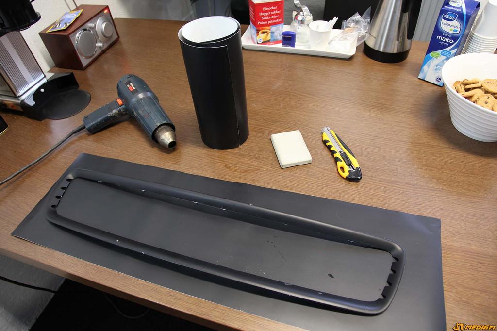 Työvälineet: mattamusta teippi, terävä veitsi, tarratussu ja kuumailmapuhallin.