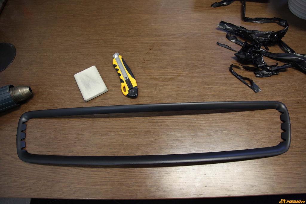 1. Irroita kehys maskista jos mahdollista (voi teipata myös pelkästään autosta irroitettuun maskiin) puhdista pinnat.