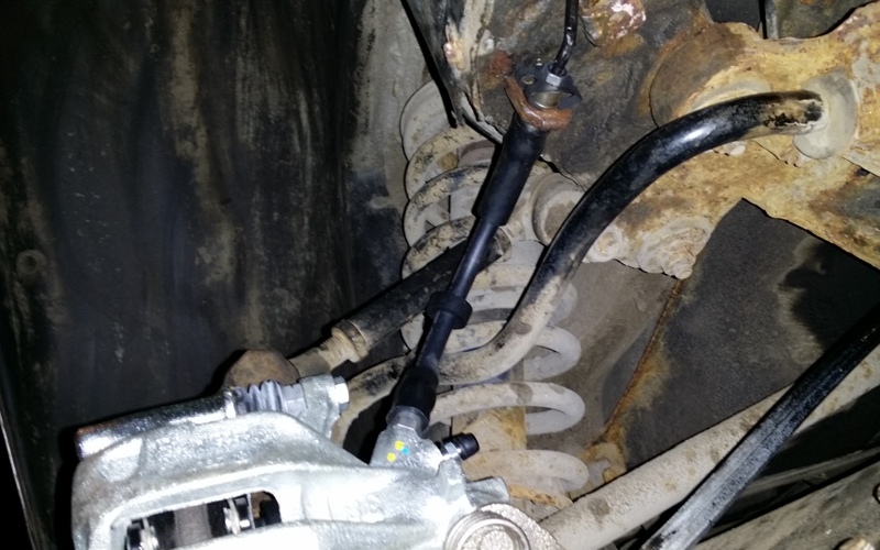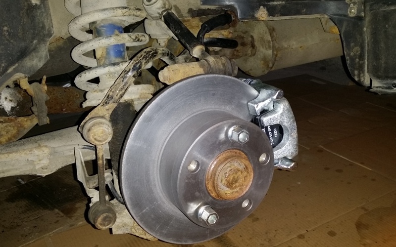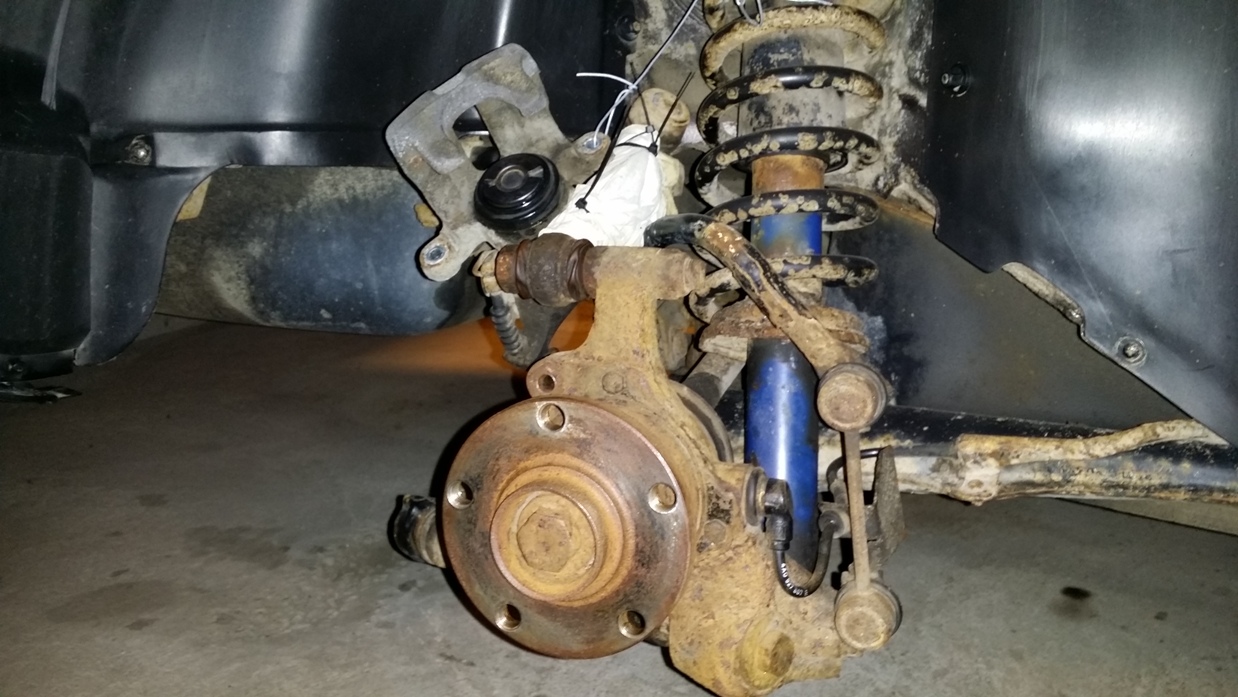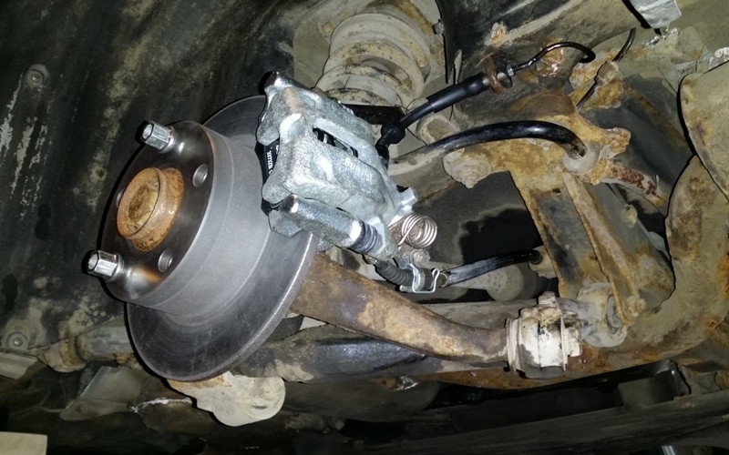 Suunnitelmista poiketen vaihdoin tällekin puolelle uuden jarrusatulan kannakkeen, koska vanha oli niin pahasti syöpynyt. Sen lisäksi tuli suunnitelmien mukaisesti uudet palat ja pultit.