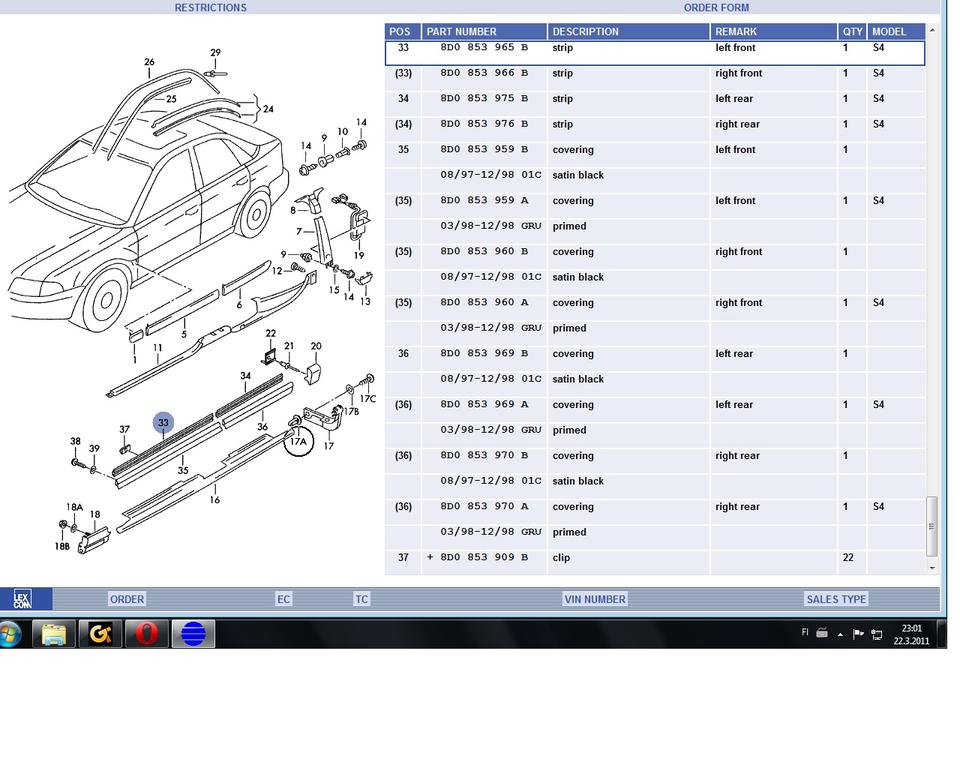 Jos jollain on edessä sama prokkis niin tässä täydelliset listojen kiinnitykseen tarvittavien kiinnikkeiden Audin osanumerot jotka tilasin Audilta: