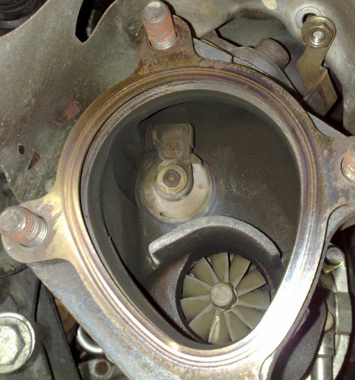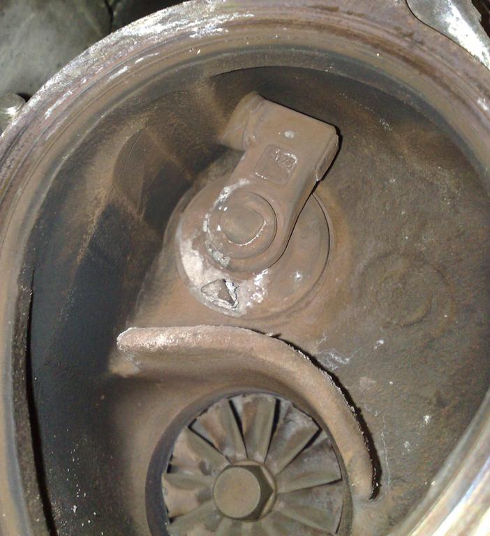 Tuossa on vielä kuvat turbosta, missä on jäähdytysnestettä ja vertailun vuoksi oletettavasti ehjästä toisen puolen turbosta.