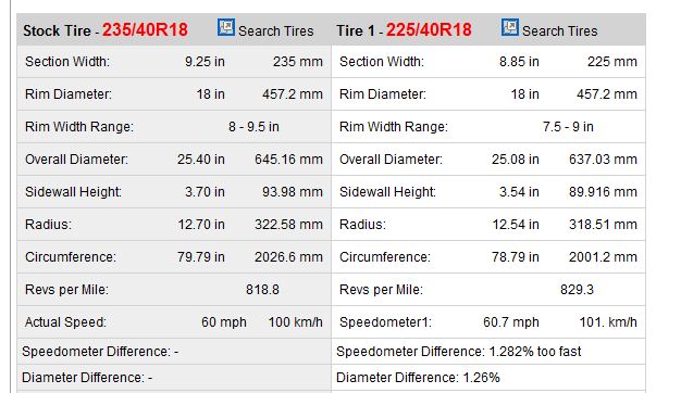Laskurilla katselin että jos taakse laitan 245/40 renkaat ja eteen 235/40 olisi halkaisijaero 7,9mm ja 1,21%.