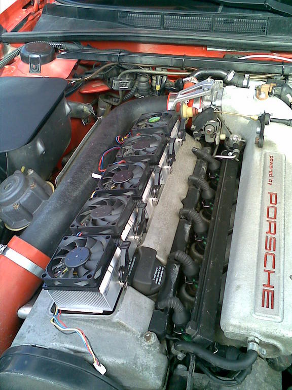 Vähän kehittelin mielessäni tuota jäähdytystä ja suojausta puolille. Hyllyssä on sattuneesta syystä melkoinen läjä AMD:n AM2/AM3 kantaisten prossujen jäähdyttimiä ja palikka sopii lähes suoraan puolan päälle. Tuuletin on tuskin tarpeellinen mutta näyttää aika hiper jutulta. Tuulettimet jo kuitenkin valmiina paikallaan ja eipä haittaa vaikka niitä joutuisi vaihtamaan kun tavaraa löytyy suoraan omasta hyllystä. Kiinnitys näyttäisi onnistuvan asiallisesti kun tekee sopivan kiskon ja öljykorkin kohdalta pitää parista jäähdytysprofiilista vähän poistaa ainetta. Uusimmissa AM3 prossuissa on ollut tosi matalia jäähdytyselementtejä ja ainakin ne sopivat korkeuden puolesta.