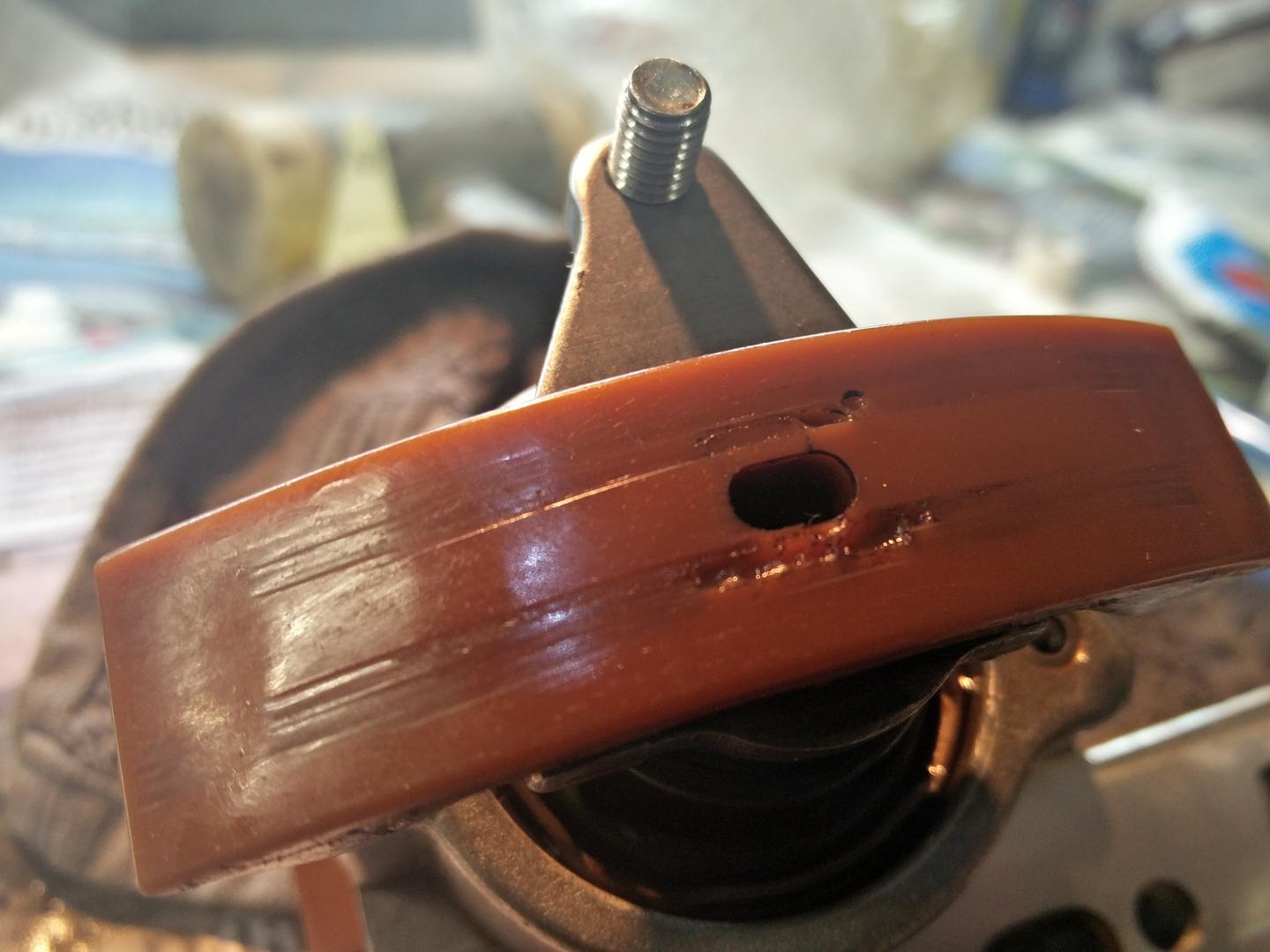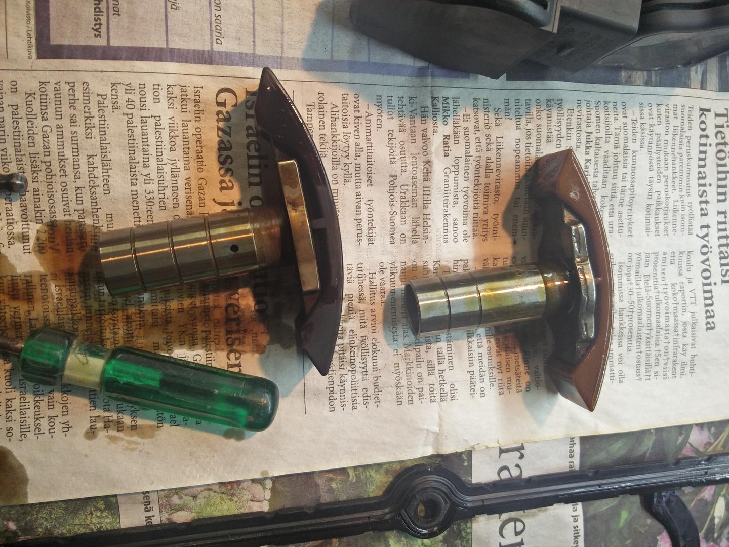 Vikaa selvitetty ja purin autosta nokkaketjun kiristimen pois ja vaihdoin sen orginaaliin niin koodi hävisi. Aika heikko laatuisia tuntuu olevan nuo tarvike kiristimet. Oma kiristin oli JP Group merkiltään (pitäs olla joku OEM valmistaja) ja kesti 15tkm. Kiristimestä oli kulunut jo yksi öljy urakin pois (kuvassa ruskealla laahaimella oleva). Kuvassa verrokkina orginaali kiristin 160tkm ajettu. Laahainkin ottanut siipeen jonkun verran.