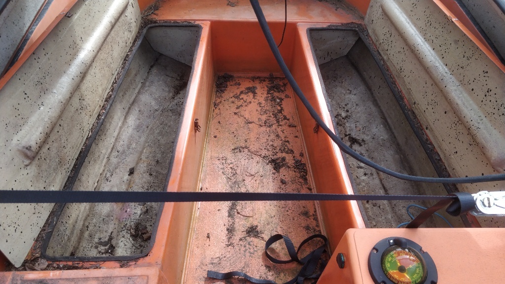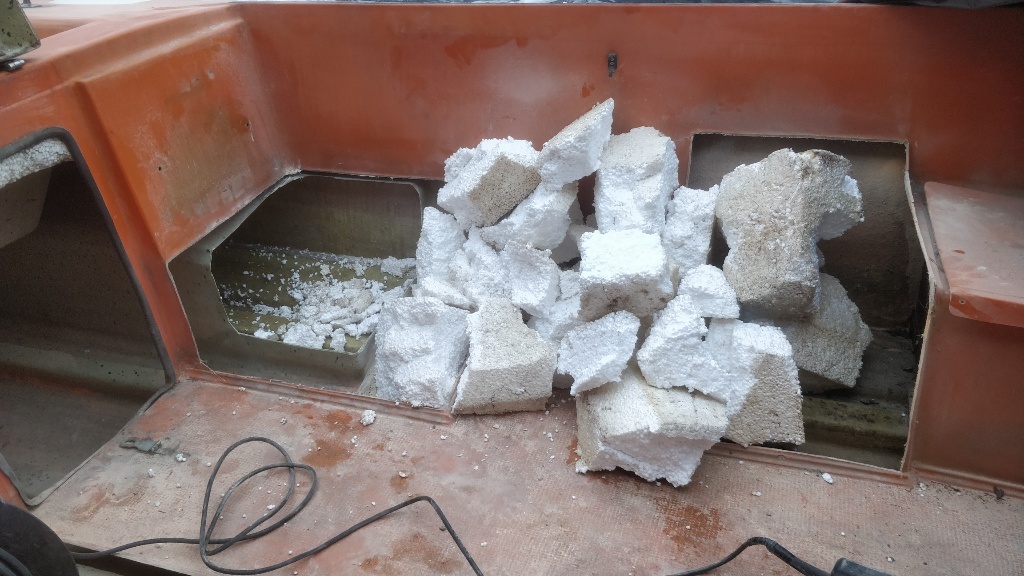 Vihdoin ehdin pitkästä aikaa valoisaan aikaan jotain puuhastelemaan. Sisäosaan piti vähä tilaa tehdä kuten aiemmin mainitsinkin, joten joutu näyttämään jonkin verran laikkaa. Kotelot auki ja vanhat styroksit pois. Oikean takakotelon olin avannu jo aiemmin ja siellä oli hieman vettä. Nyt tässä vasemmassa oli aika painavat styroksit, et vettä sielläkin ollu jonkin verran.