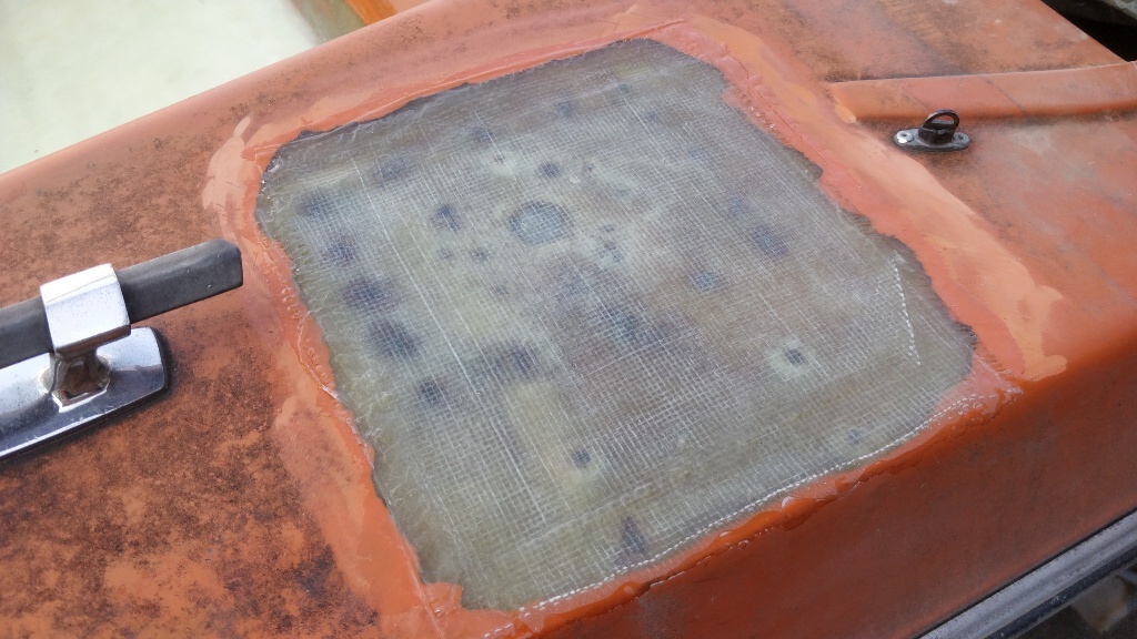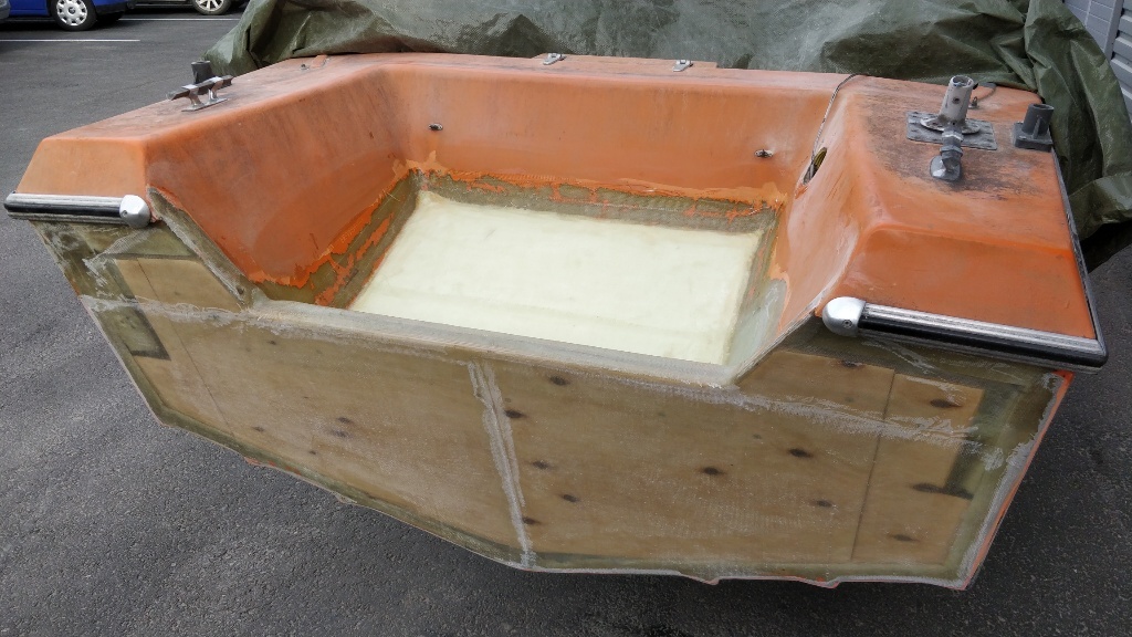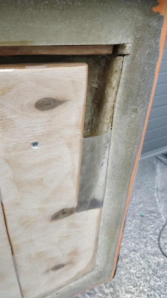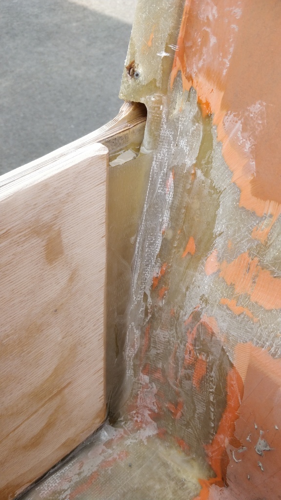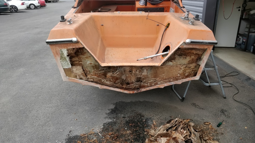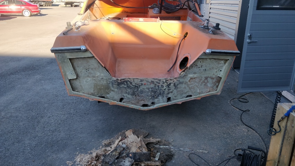 Elikkäs takalaita tuli samoin tein otettua työn alle, se olikin melkoista reikäjuustoa ja oli vahvisteltu jo useampaan otteseen. Sisällä oleva vaneri oli läpimärkää, tosin ei vielä ollu kukkamullaksi muuttunu, minkä tuli huomattua kun sitä nirhas irti tuolta. Ei lähteny ku pikkusina palasina. Pakko oli jättää selkee kuitureuna kiertämään takalaitaa et siihen saa laminoitua uuden pinnan kiinni. No lopuks oli putsattuna kaikesta puusta, ja kuidutin ylimääräisen kerroksen tohon sisä"nahkaan", samalla kun sen kuidutin myös pohjaan ja sivuihin kiinni.