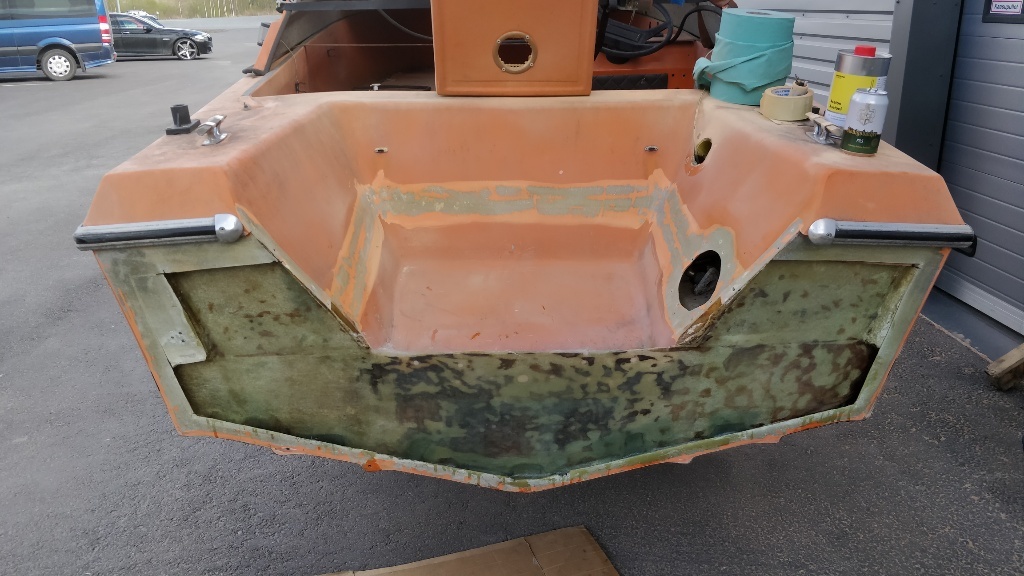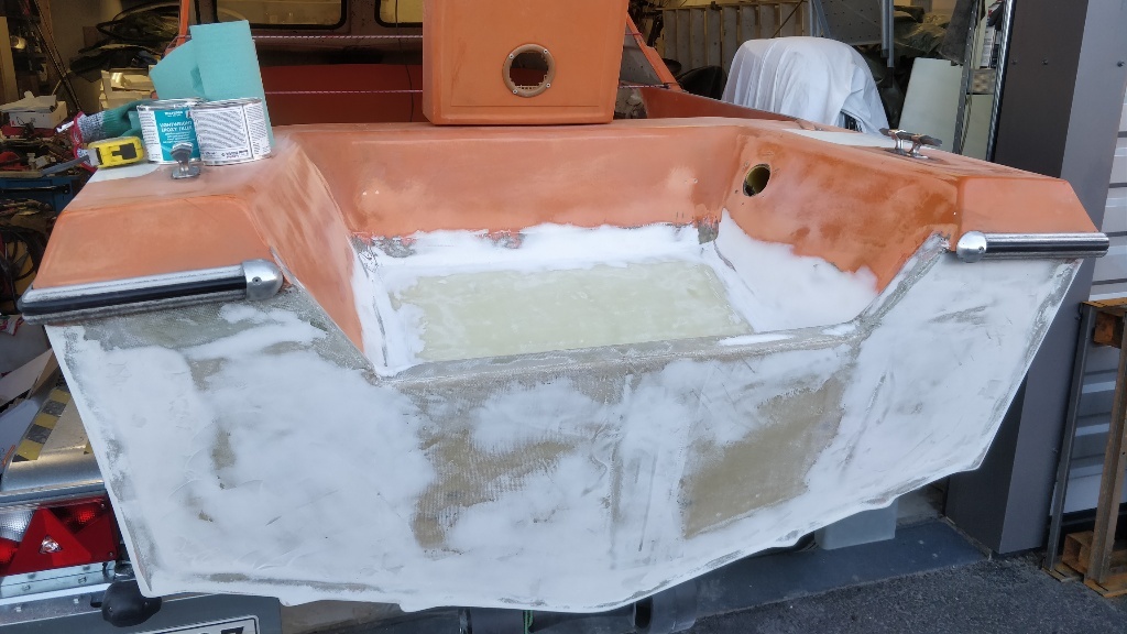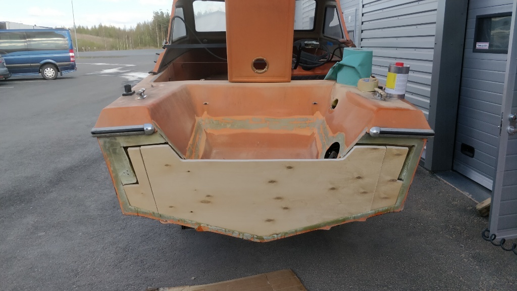Kittasin ja hioin vielä kerran ton takalaidan, ja nyt vaikuttais ihan siistiltä. Muutama kerros epoksimaalia vielä päälle ennen lopullista pintamaalia. Toki teen siinä välissä vielä muutkin reiät, esim. kalasumpun pumpulle tulee yks reikä, mutta pumppu on vielä tulon päällä, joten sitä joudun vielä odottelemaan et saan sovitella reiän oikeaan kohtaan.