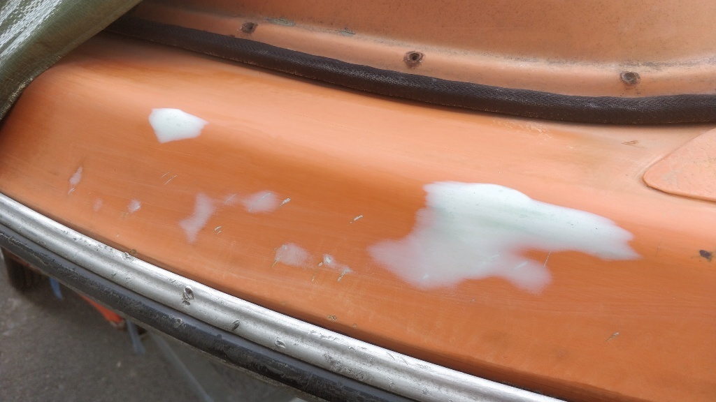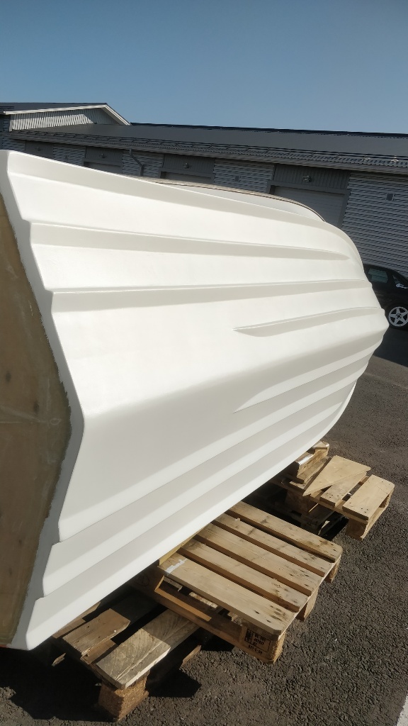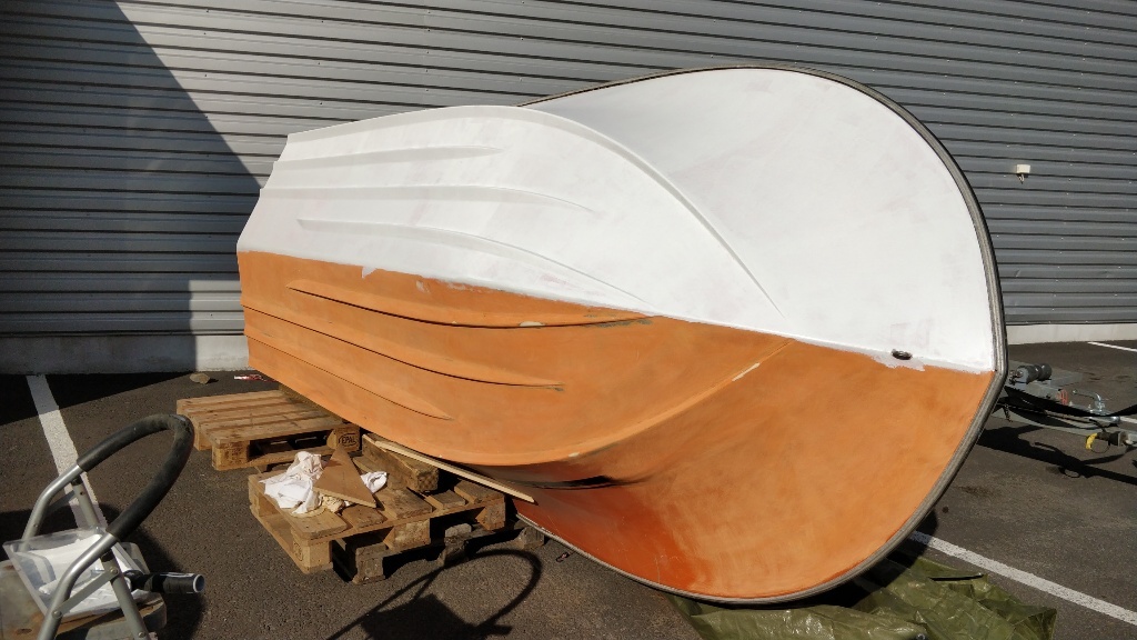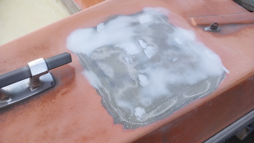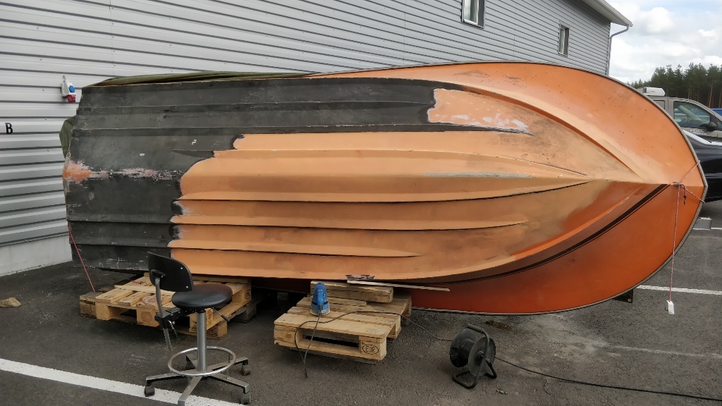 Mukava yllätys oli ettei pohjasta paljastunut mitään pahempia vaurioita tai vanhoja korjauksia. Ainoastaan kölistä oli topcoatti kulunu puhki ja kuidut oli näkyvissä, siihen kuidutin kolme uutta kerrosta. Muuten oli jokunen pikku kolhu ja naarmu jotka sai päälleen epoksikittiä. Kun kittaukset oli kuivunu ja hiottu, päälle tuli epoksimaali vesisuluksi. Kaiken kaikkiaan pohjaan tuli viisi kerrosta ja kylkiin kaksi kerrosta.