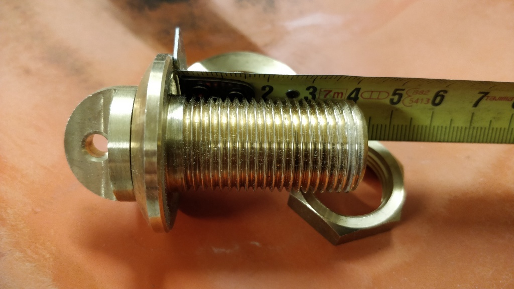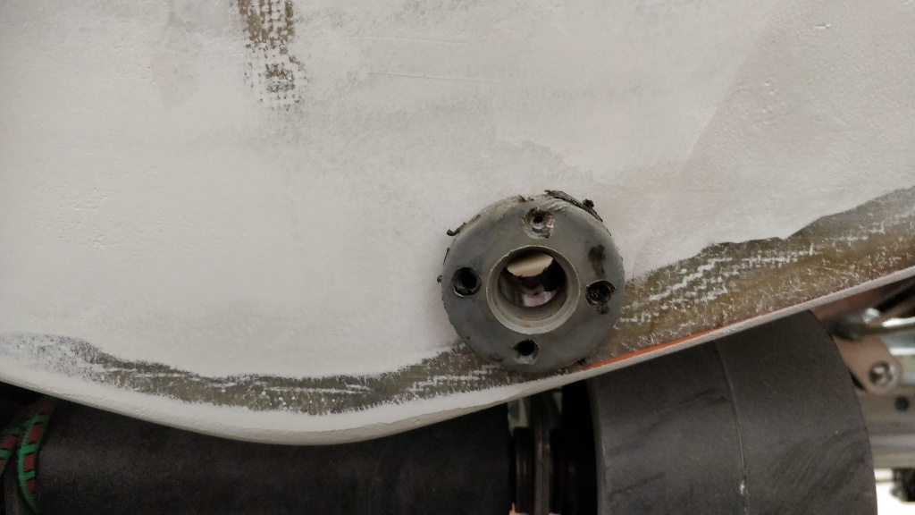 Pikku näpertelyä, mutta ihan putkeen ei menny tuon takalaidan tyhjennyspropun kanssa. Kierteen pituus ei riittänyt, takalaidan paksuus oli just sen 40mm vaikka kuvittelin sen ohuemmaksi tuolta alhaalta. Jouduin tilaamaan uuden läpilähdön, Terhin muovisen version. Yks käytetty semmonen oli miljoonalaatikossa malliksi reiän suurentamista varten, mutta uuden toki laitan siihen. 3M 5200 liimaa tilasin myös noita läpilähtöjä varten.