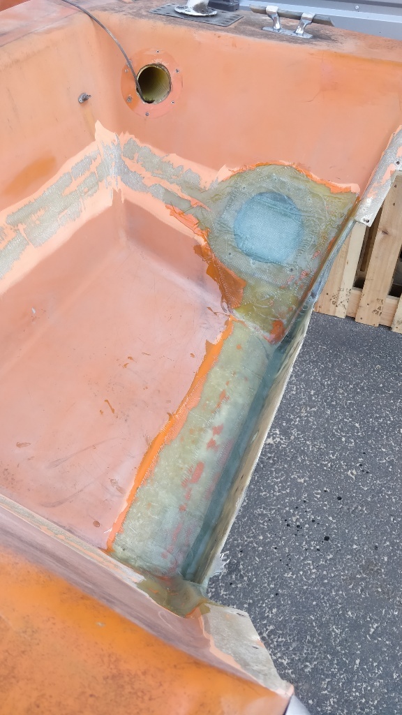 Elikkäs takalaita tuli samoin tein otettua työn alle, se olikin melkoista reikäjuustoa ja oli vahvisteltu jo useampaan otteseen. Sisällä oleva vaneri oli läpimärkää, tosin ei vielä ollu kukkamullaksi muuttunu, minkä tuli huomattua kun sitä nirhas irti tuolta. Ei lähteny ku pikkusina palasina. Pakko oli jättää selkee kuitureuna kiertämään takalaitaa et siihen saa laminoitua uuden pinnan kiinni. No lopuks oli putsattuna kaikesta puusta, ja kuidutin ylimääräisen kerroksen tohon sisä"nahkaan", samalla kun sen kuidutin myös pohjaan ja sivuihin kiinni.