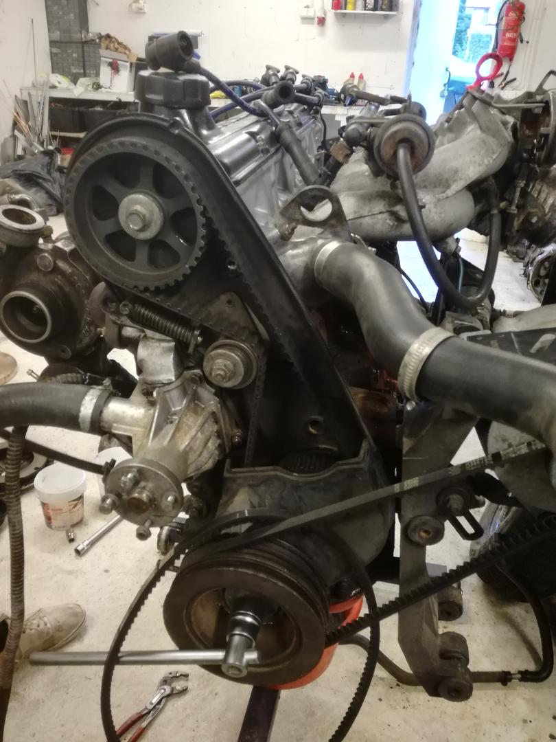 Siis kellari auki ja tutkimaan vauriot. Kolme veiviä oli silmämääräisesti ainakin banaanina. Onneksi velipuolelta löytyi spm veivit, volvon vahvin m90 laatikko ja jotain laakereita hyllystä. Ne tuli lunastettua pois ja kasa muita osia tilattua. Alakerta meni kasaan uusilla laakereilla ja männänrenkailla, Tässä oli paikoillaan 530 pieni venttiili kansi josta päädyttiin luopua ja tilalle 531 iso venttili kansi vähän siistittynä ja kg trimning nokalla kun sattui sopivasti myynnissä olemaan. Tuubisarja löysi myös oman paikan ja siihen jatkoksi tallista holsetin hx35 ja iso kiina cooleri. Ahtoputki aineet ja tt bypass löytyi myös nurkista, Moottorin ohjauksena tässä on volvon oma lh2.4 joten maf piti suurentaa. S2 maffista joskus katkesi lanka ja sitä ihmetellessä näytti lähes samalta mittapää kinnitykseltä kuin volvossa. No näinhän se oli että vaihtoi vain volvon mittapään audin runkoon. Jakajasta päätin myös luopua ja kaveri kolvasi lisäkortin ezk boxiin jonka päähän tuli vag hukkakipinä puola uusilla tulpan johdoilla.