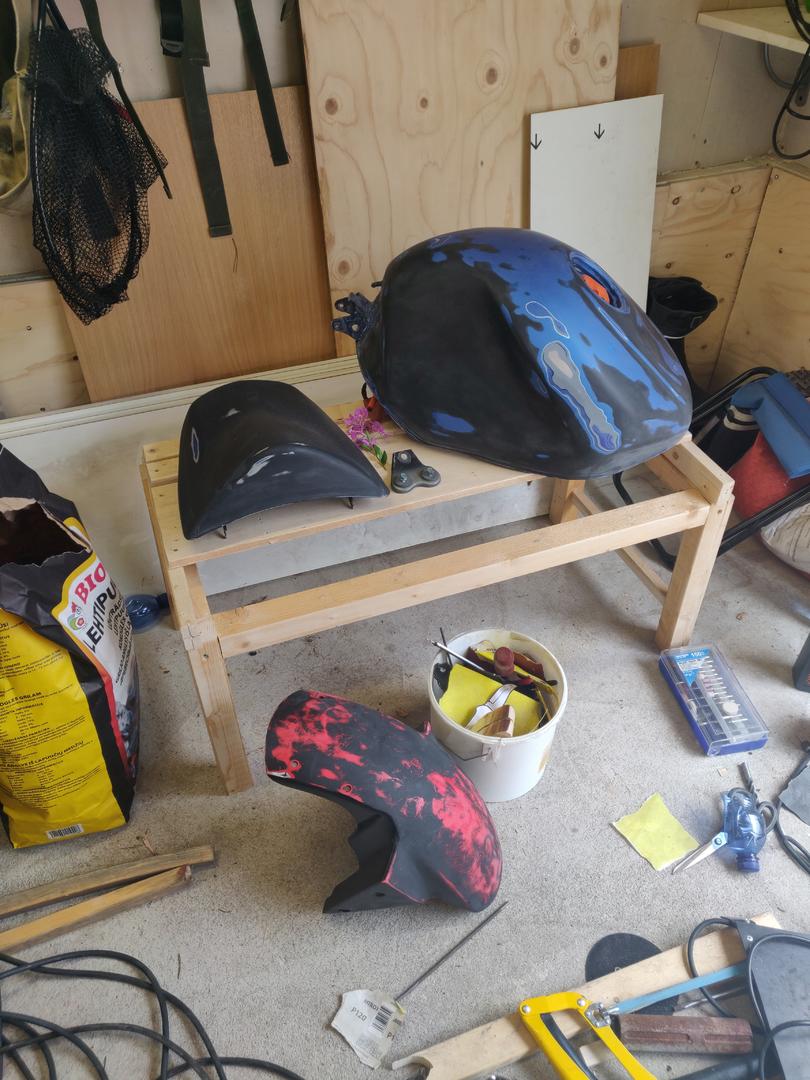 Tekniikaltaan vaikutti olevan aivan iskussa, mutta ulkokuoressa ei muuta ollutkaan kuin sanomista. Joka paikkaa oli leikelty ja silvottu, ja olipa tähän toisen kyykkypyörän katteetkin saatu jollain konstilla paikoilleen. Pari päivää ajelin, kunnes tuuppasin talliin ja ajattelin alkaa vähän siistimään.