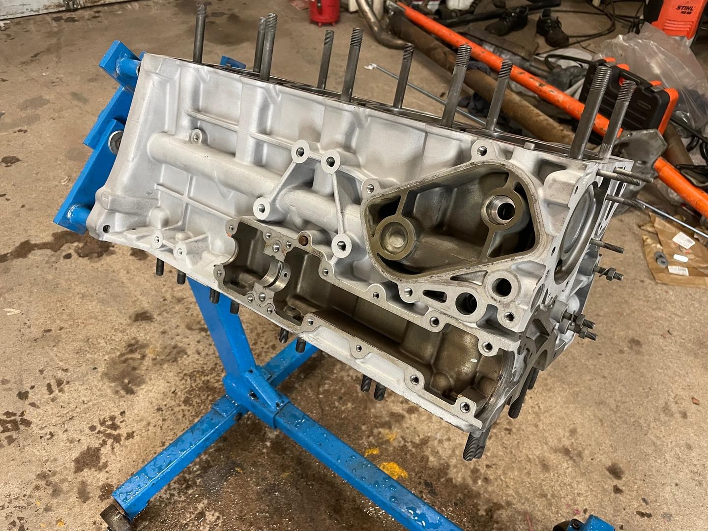 Sitten päästäänkin siihen miksi tämä on projekti. Autoa kun kävin katsomassa, niin konehuoneessa lymyili paljon sähköjohtoja ja vesiletkuja, mutta jotain isompaa uupui kuten kuvistakin saattanee havaita. Auton konehuoneessa on ollut pienimuotoinen tulipalo, jonka korjaus oli ehditty jo hyvin aloittamaan. Mm. uusi johtosarja oli siirretty toisesta turbosta kuin myös vesiletkut ja muut irralliset hilppeet. Tässä yhteydessä myös keula oli maalattu uudelleen vaikka edellisestä maalauksesta ei tietojeni mukaan vielä kauaakaan ollut aikaa. Kuitenkin kone todettiin purettaessa melko valmiiksi kauraksi joten uutta konetta alettiin autoon rakentelemaan. Kuitenkin itselleni hämäristä syistä koneen kasaus ei koskaan saanut oikein tuulta alleen ja projekti seisoikin vuosia tallin nurkassa pölyä keräämässä.