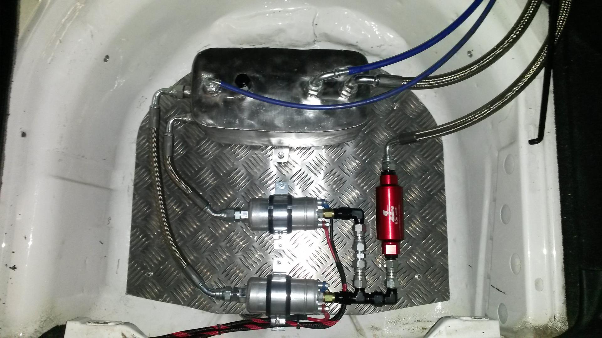 Polttoaine puolelle tallikaverin avustuksella tuli auton alle 12mm tarkkuusteräs linjat ja konttiin n. 5 litran välisäiliö loiskelevyin. Pumpuiksi valikoitui 2kpl bosch 044, suodattimeksi aeromotive kuin myös paineensäätimeksi. Pumppuja ohjataan puolijohde releillä.