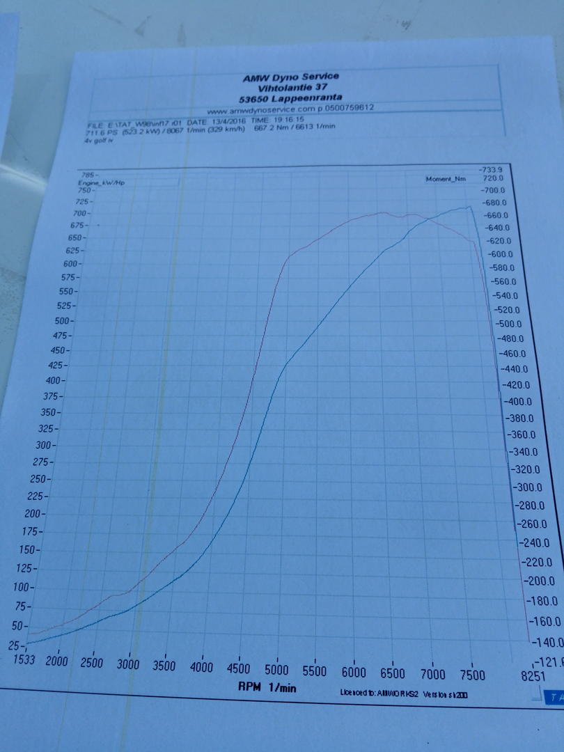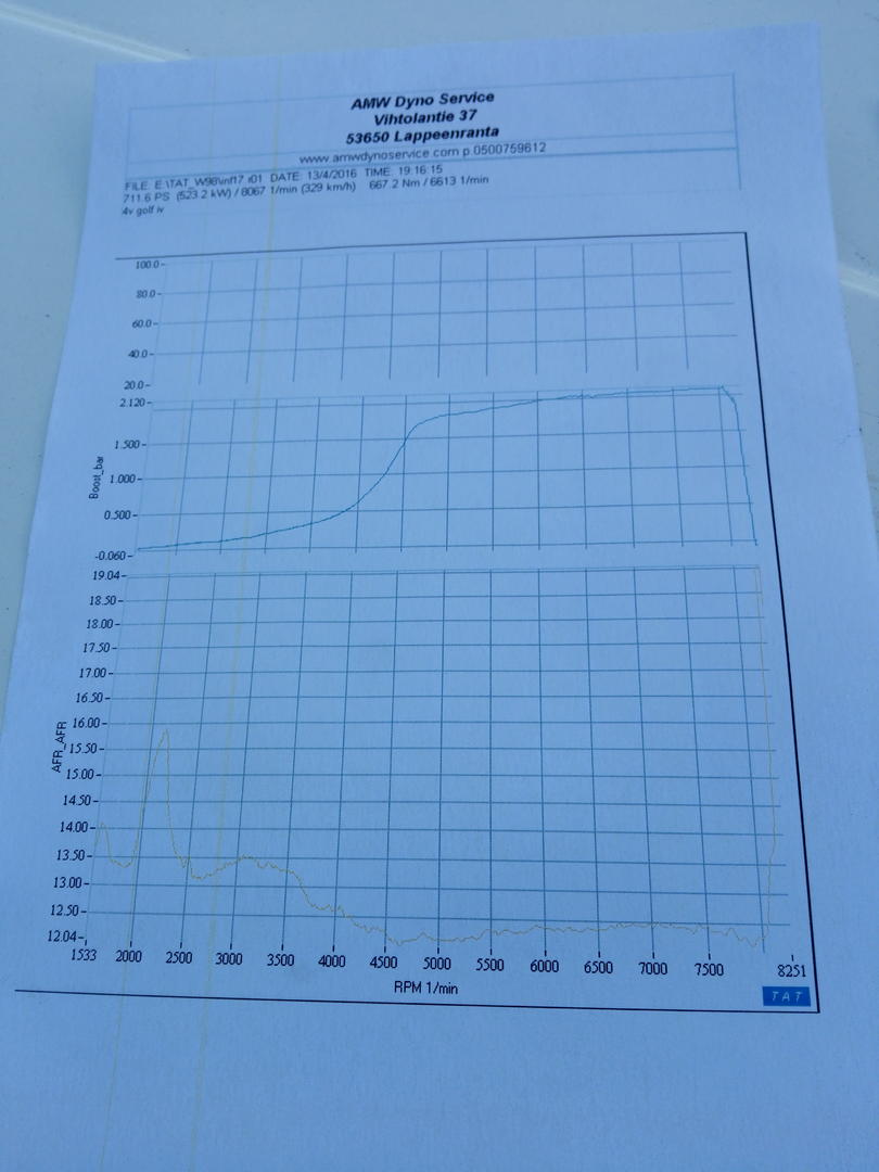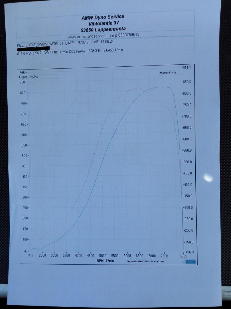 Viikko sitten käytiin pyörittelemässä rullia AMW dynoservicen uudella rullalla ja hyvältähän se vaikutti. Kartat löytyivät hienosti kohdilleen, jonka jälkeen alettiin hakemaan kierroksia. Asianomaiset yllätti hieman tuo tehokäyrä, joka ei näyttänyt laskemisen merkkejä. Viimeiseksi rajoittajaksi jäikin 8350rpm ja edelleen nouseva tehokäyrä. Ahtopainetta 2.1bar ja pakopainetta 1.7bar. Näillä meni omat varovaiset tavoitteet rikki ja päivä samalla purkkiin.