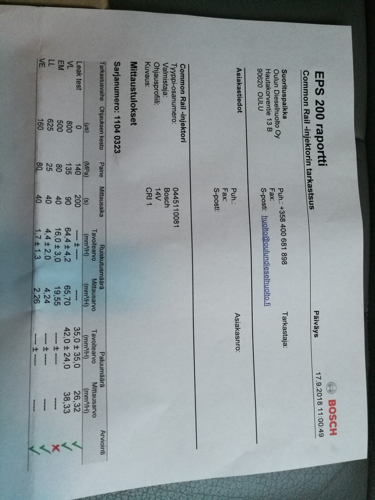 Suutin siis kävi huollossa ja sille tehtiin ultraäänipesu sekä koeajettiin penkissä, liitteessä paperi. Yksi arvo on punaisella mutta se ei kuulemma kovasti haittaa, jonka uskon. Suutin todettiin siis ehjäksi ja toimivaksi.
