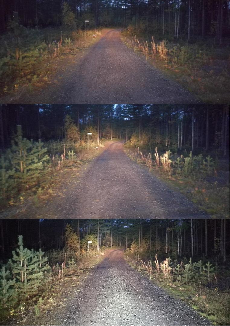 Pitää pikkusen nostaa keilaa ylemmäs ja ottaa pimeellä tiellä uus analyysi. Huom, tietysti suljetulla tiellä, koska näitähän myydään työ-/tulvavalona eikä taida pelkkä CE-hyväksyntä riittää tieliikenteeseen.