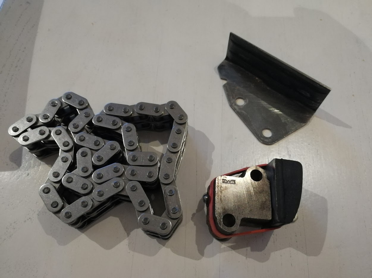 Tänään tuli viimeiset puuttuvat osat koneeseen. Tuota pahuksen ketjunkiristintä, ketjua ja liukua sai etsiä oikein tosissaan. Noita myydään käytettyinä Ebayssä jonkin verran, mutta en nyt sellaista tuonne kehtaa laittaa. Melkoisesti eroa noihin vanhoihin, tosin onhan ne sen >40v siellä pyörineet.