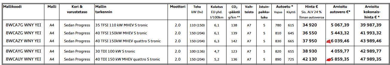 Otin verrokiksi voluumissa suositun mallin eli A4 Avantin (tosin näemmä kopioin sittenkin sedanin hinnat - sorry!) :