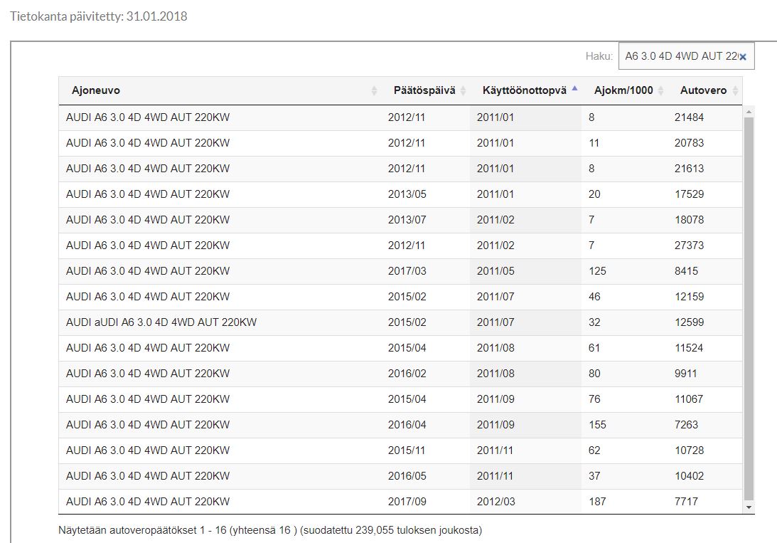 • Kysästään täältä. Eli a6 4g vm 2011 3.0tfsi sedan 160tkm ajettu. En löytänyt kuin viime vuonna tuodun 70tkm ajetun ja vm 2012 audin tiedot jossa verot oli ollut noin 11k€. Näänkö jostain vähän lähemmän arvion tai pystyykö joku täälä heittään jotai?