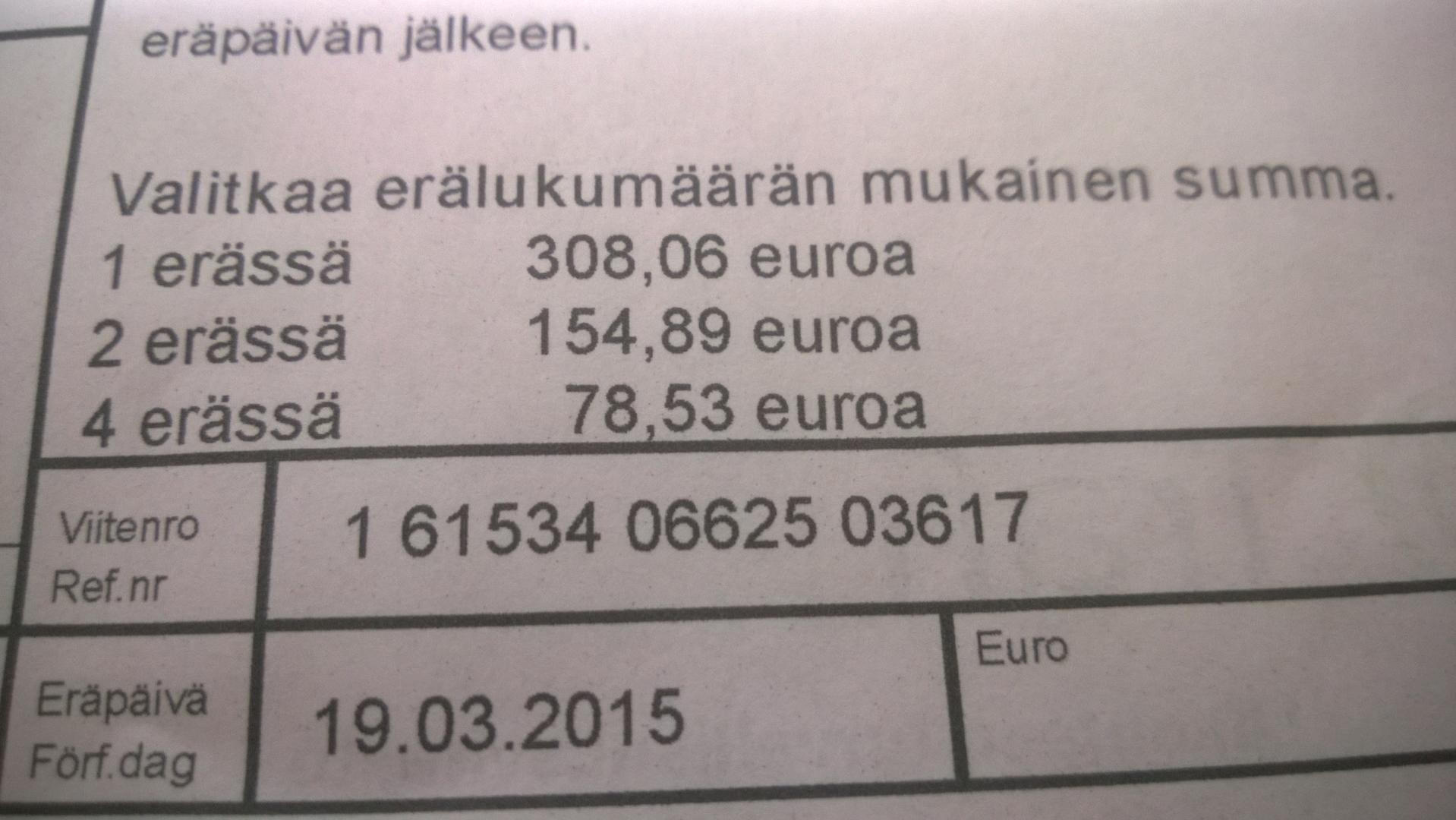 Tarkoitin siis sitä, että jos maksaa useammassa kuin yhdessä erässä, niin ekan erän summa on se mikä tuossa on näkyvissä. Seuraava lasku tulee sitten eri summalla, olikohan se joku maksutapalisä mikä siihen tulee lisää. Toisin sanoen se kokonaissumma useammalla erällä ei jää halvemmaksi kuin yhdessä erässä kerralla maksaminen, kuten tuosta lapusta voisi luulla. Muistaakseni se on selitetty laskun kääntöpuolella/mukana tulleessa toisessa lapussa.