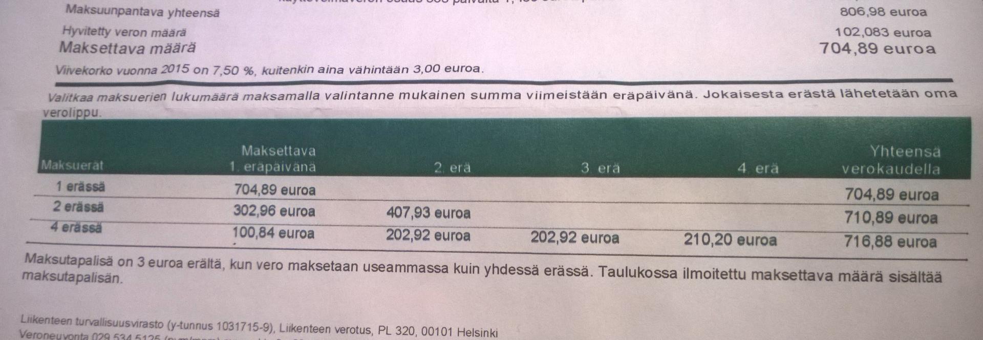 Tässä yhden kulkineen lappu, jossa maksusummat olis: