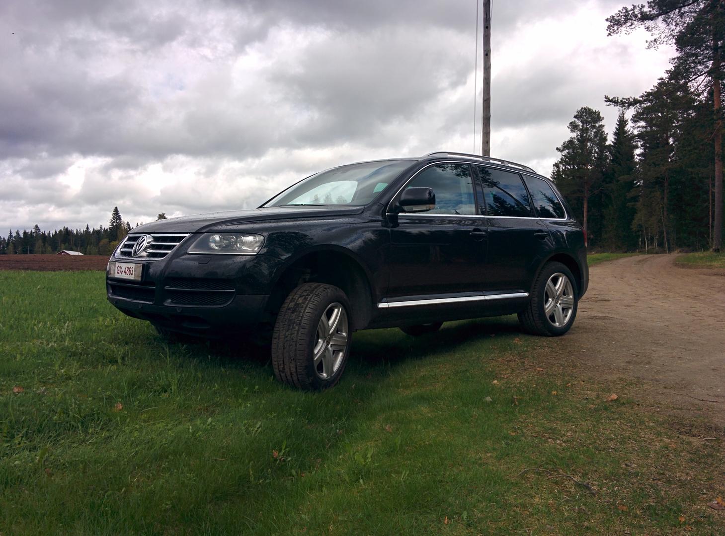 En ole näyteikkunaan laittanut volkkarista mitään. Touaregi on 07 mallinen ruotsin tuliainen eli viimeisiä vanhakeulaisia, ilmajousilla ja sähkönahkasisustalla ja afs bixenoneilla ja muuten suht perusvarusteinen 3.0tdi. Lukkoja ainoastaan keskellä, ei ole takalukkoa ruksittu. Metrejä tuolla on vain 139tkm mittarissa, mutta laittamista siinä on vielä jonkin verran. Maalipinta on melko naarmuinen ja muutama ruostekohta vaatii myös korjaamista. Takaluukkuun täytyy uusia johtosarjat että takaluukun lasin saa auki. Hirveän pihi menijä se ei ole mutta 2,5 tonnin omamassalla lienee siihen osuutta sekä sen takia suht leveillä kumeilla. Tilaa siinä on ihan kohtuudella ja tuo menee kiltisti aika hankalassa maastossakin kun nostaa offiasentoon, ja kytkee alennusvaihteiston ja keskilukon. Menee ristiriipunnastakin, tuossa kuvassa juuri kokeilin ja takatassu on ilmassa. Vanhaksi aloin itsenikin tuntea, mutta ei tuon kanssa ostokrapulaa ole tullut. Kannattaa käydä kokeilemassa. Käytännössä tuo on lyhyt Q7 hieman tylsemmällä sisustalla. Ilmajouset ja v6 tdi tuntuu olevan vaikeasti löydettävä yhdistelmä, mutta jotenkin tollaiseen möhköön ne kuuluu. Meinasin ensin v8 bensalla tuota tai cayennea, mutta kilsoja tulee nykyään sen verran että diiseli vei voiton.