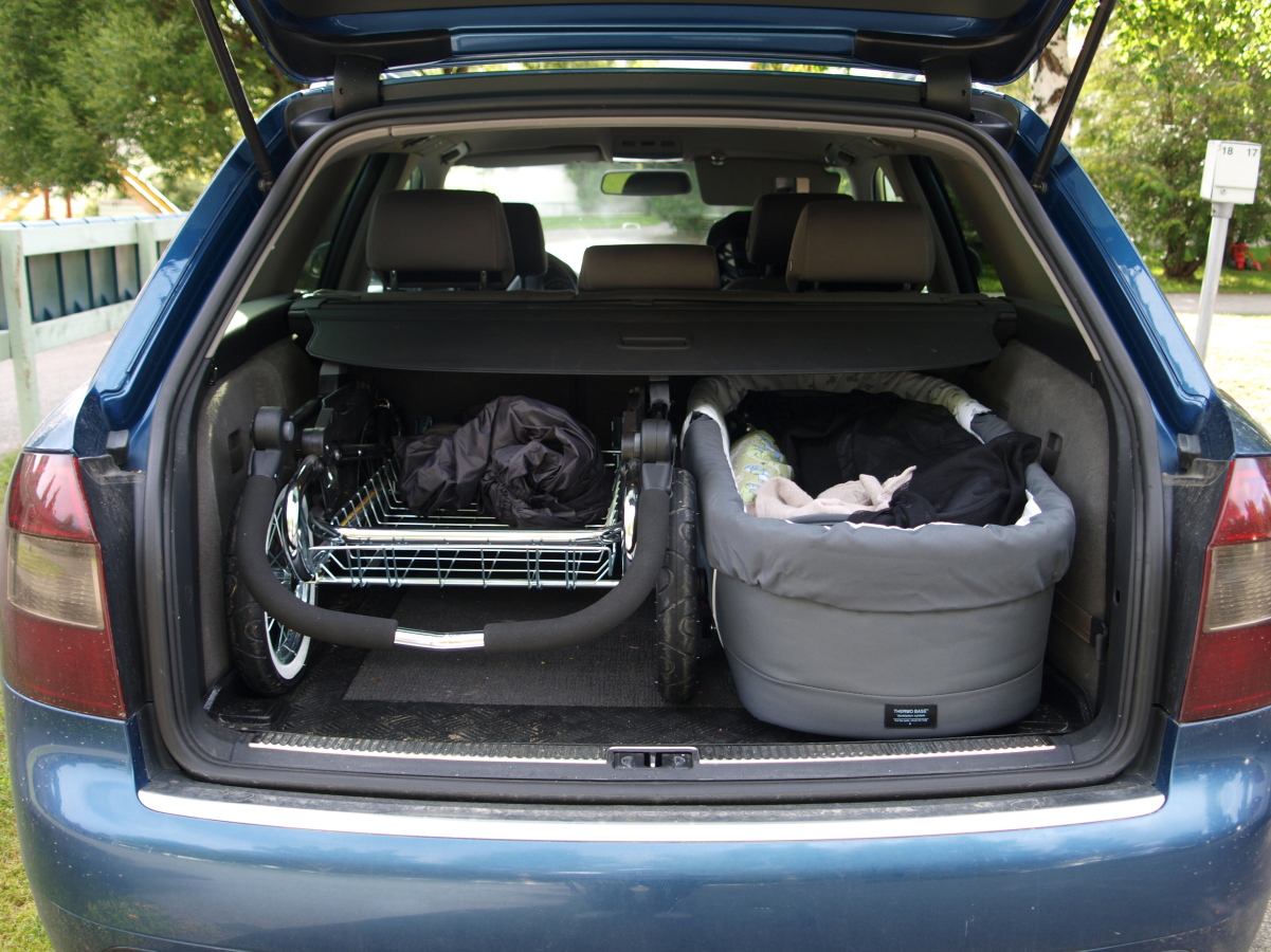 Jotenkin tuntuu omaan päähän mahdottomalta ajatukselta sovittaa noutaja ja kärryt samaan luukkuun.. ja mihis sitten muut tavarat?