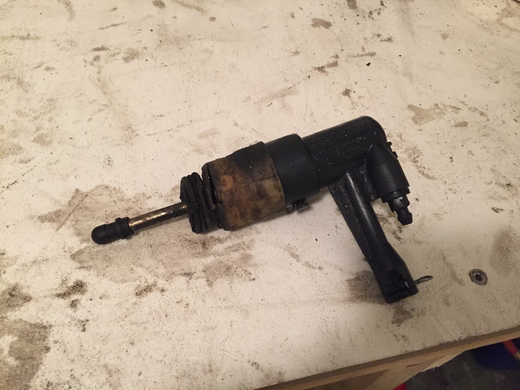 • Jakopäärempan yhteydessä kaikki kovasti suosittelee kytkimen työsylinterin vaihtoa samalla. Tämän voin nyt allekirjoittaa. Jostain käsittämättömästä syystä jäi sillon tilauksesta pois ko. osa ja auto piti saada läjään viikonloppuna. Päätin nyt sitten jälkikäteen vaihtaa ja olipahan homma. Kaksi kertaa tappi meni ohi haarukasta, kolmannella onnistui. 15h sai tuohon uppoamaan. Prkl. Vanha olikin aika valmis.