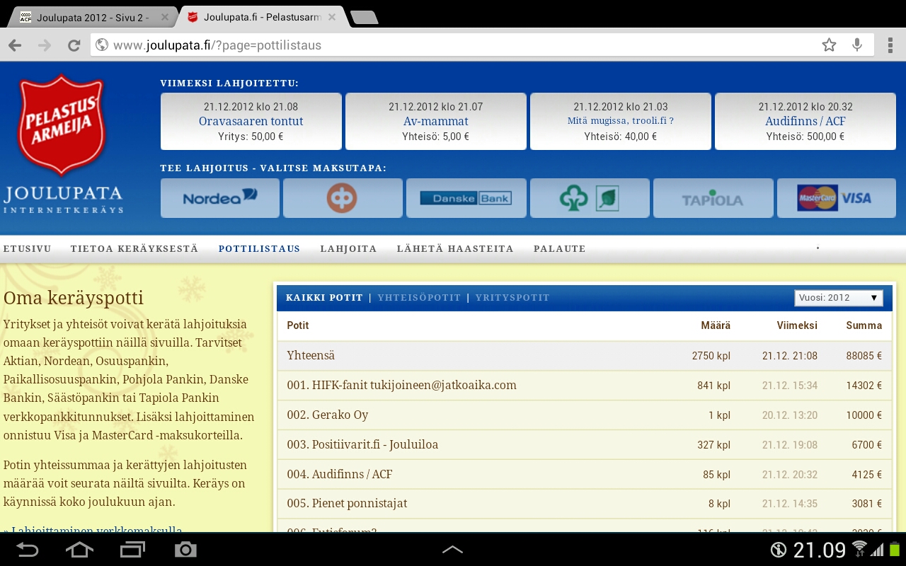 Edit: Jaa Kaikkien pottien listaukseen tullut 10ke lisäys Gerako Oy:ltä, eli ei saada Kaikkien pottien listauksessa kyllä 3 sijaa, mutta 4:nen näillä näkymin, Yhteisöpoteissa taas häämöttäisi 2.sija :).Viimeksi muokannut 54mmy; 20.12.2012, 14:31.