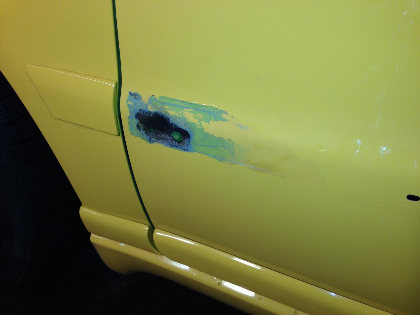 Tästä puolitoista vuotta eteenpäin lokakuuhun 2013. Auto myllytettävänä ja kappas, VV-Auton maalaama kuskinoven lista korkkaa ennen kuin myllyttäjä edes kunnolla alkaa sitä työstää. Kaikki muut listat ennen tätä ovat toki myllytyksen kestäneet. Hommaan uuden listan ja maalautan sen ja myllyttäjä osallistuu kustannuksiin. Tammikuussa 2014:sta sitten tulee sopiva hetki, jolloin löytyy aikaa ruveta listan vaihtohommiin, niin arvaattekin varmaan, mitä tapahtuu. Listaa irroittaessa VV-Autossa maalatusta ovesta lähtee maalit kuvan osoittamalla tavalla. Alta paljastuu pohjatyöt ja mikä vaikuttaisi joltain Noveroxilta tai muulta vastaavalta aineelta.
