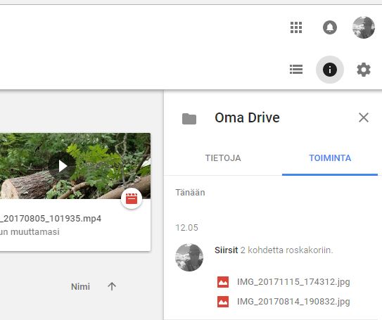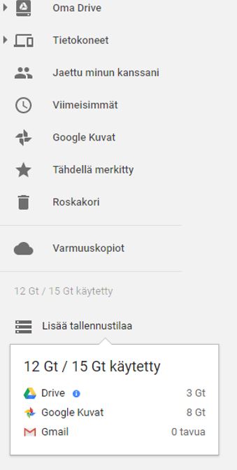 Erikoiseksi tän tekee se, että kun katson 'Lisää tallenustilaa', se kertoo että Google Kuvissa on käytetty 8GT ja itse Drivessa (missä siis nämä kadonneet folderit ovat tai olivat) olisi käytetty 3GT. Eli systeemikin kertoo jossain olevan 3GT dataa mutta en tiedä missä.