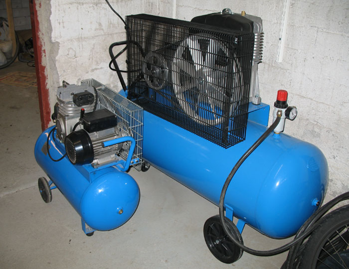 Olen rakentanut tuolle vielä kaveriksi paineilmaverkon niin, että jokaisessa huoneessa on vedenerotin ja paineensäädin ja 2kpl mittareita (verkon paine/säädetty paine). Vertailuna vieressä 50 litran säiliöllä oleva vanha kompressori.