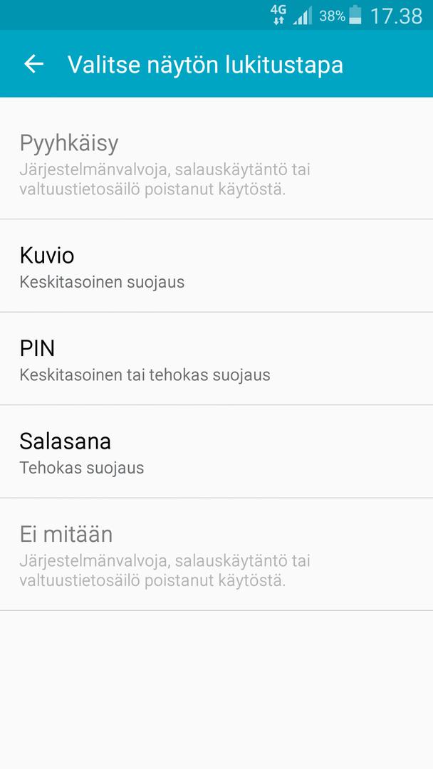 Edit. Yritin Turvallisuuden alta poistaa järjestelmävalvojista Android-laitteenhallinnan, mutta ei silti anna vaihtaa lukitusmuotoa.