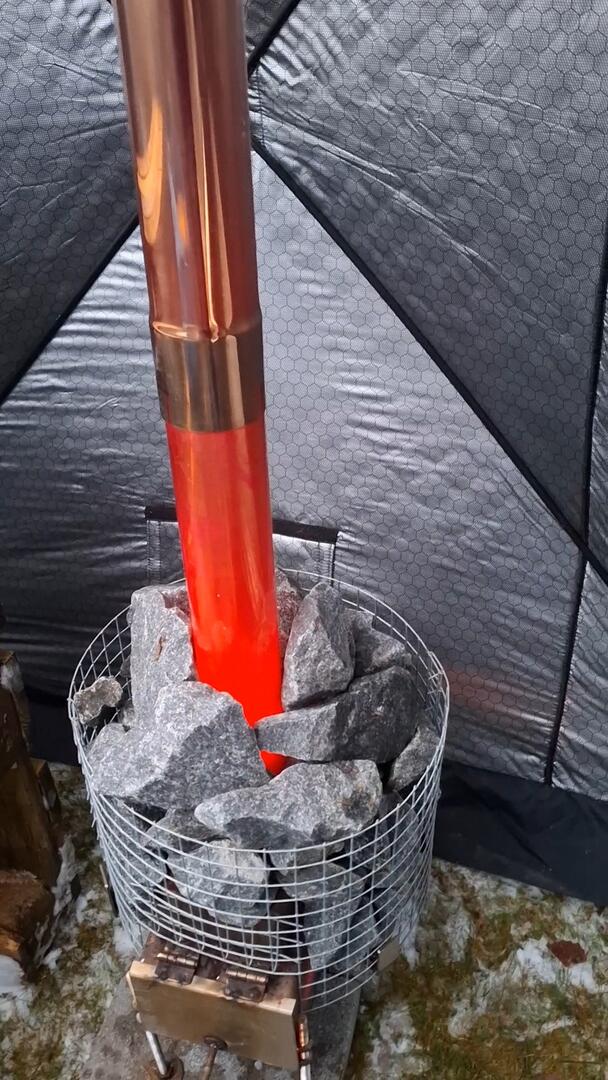 Kiukaan kivet ladoin uudella tavalla. Suuremmat tuli verkon reunoille ja pienemmät lähemmäs tulipesää. Joku ajatus mulla oli miksi noin olisi hyvä mutta en enää muista mikä se ajatus oli.