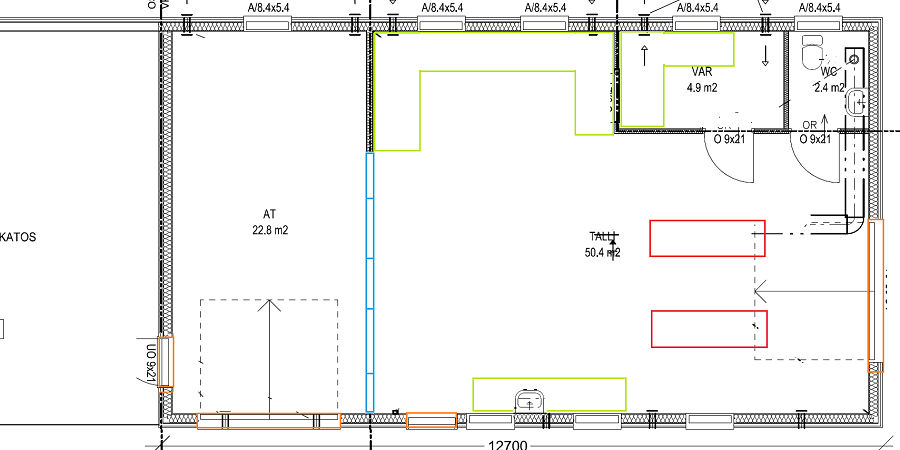 Sinisellä tarvittaessa avattava ~4.5m pitkä väliseinämä.