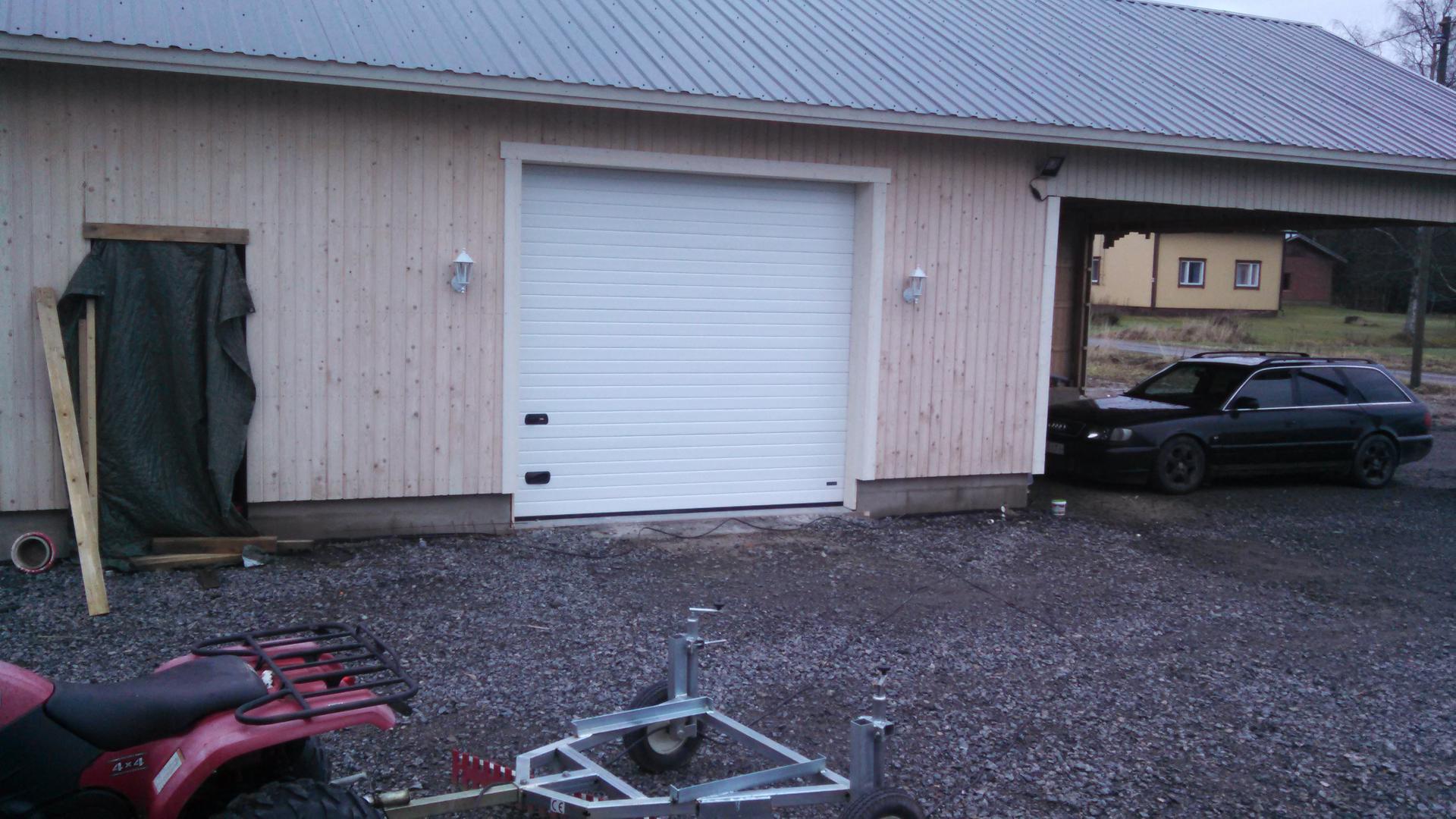 Jäljellä olis nosto oven tilaus, sisämaalaus 10l vedettynä ei valmis, sähköistys pinta asennuksella, käyntiovi, kipsien kiinnitys lattia tasosta listoilla kun on 50mm foam takana.