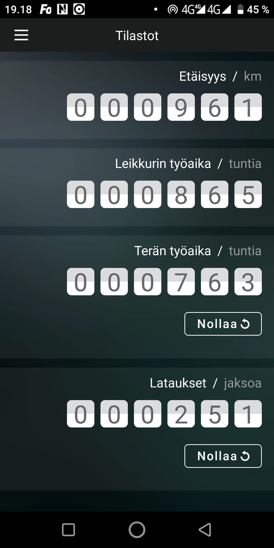 2000km se on jo ajellut pihaan edes takasin ja 1500 tuntia. 460 latausta, akku edelleen on ihan ok kun kestää noin 3h leikkaamista.