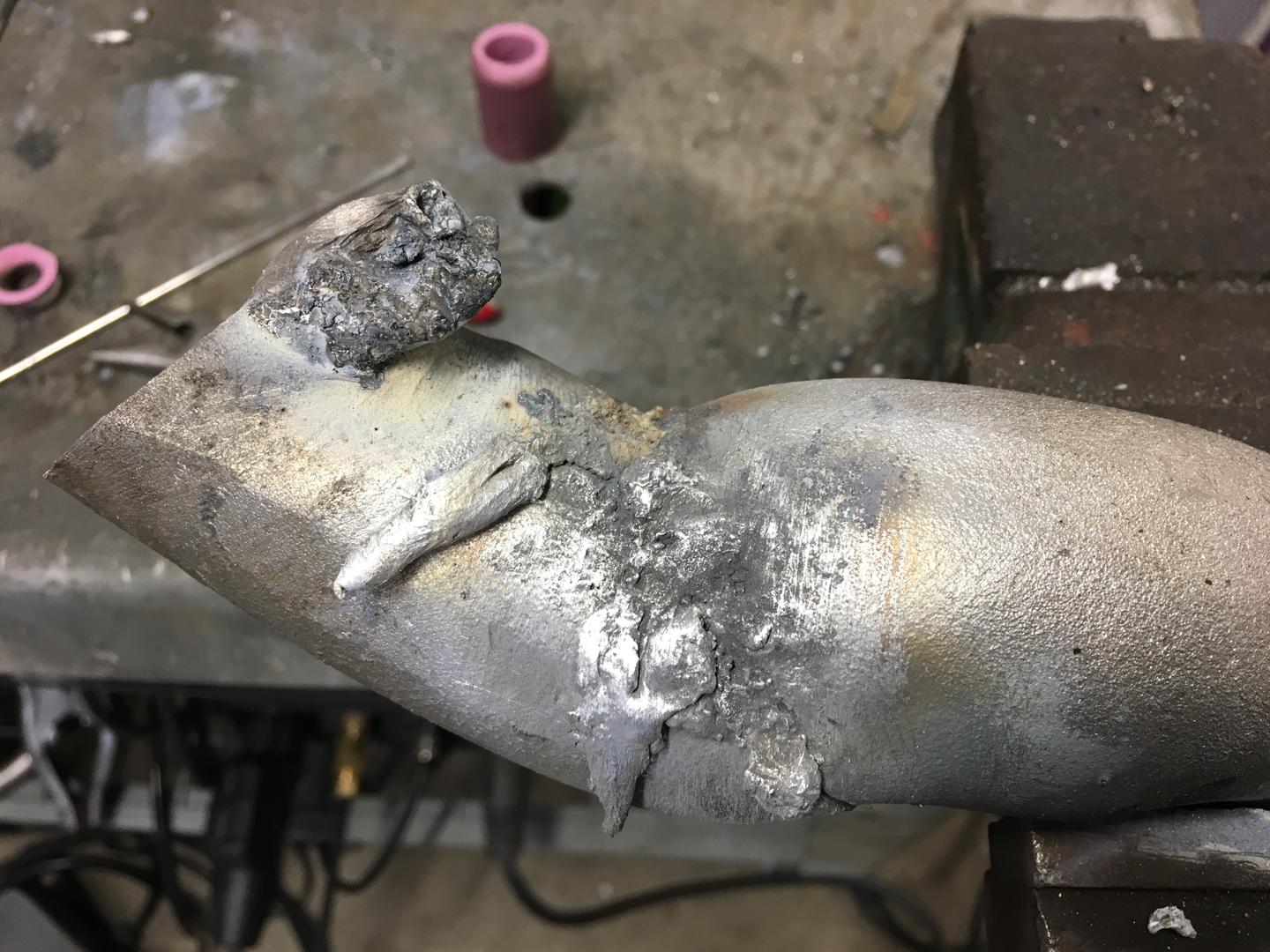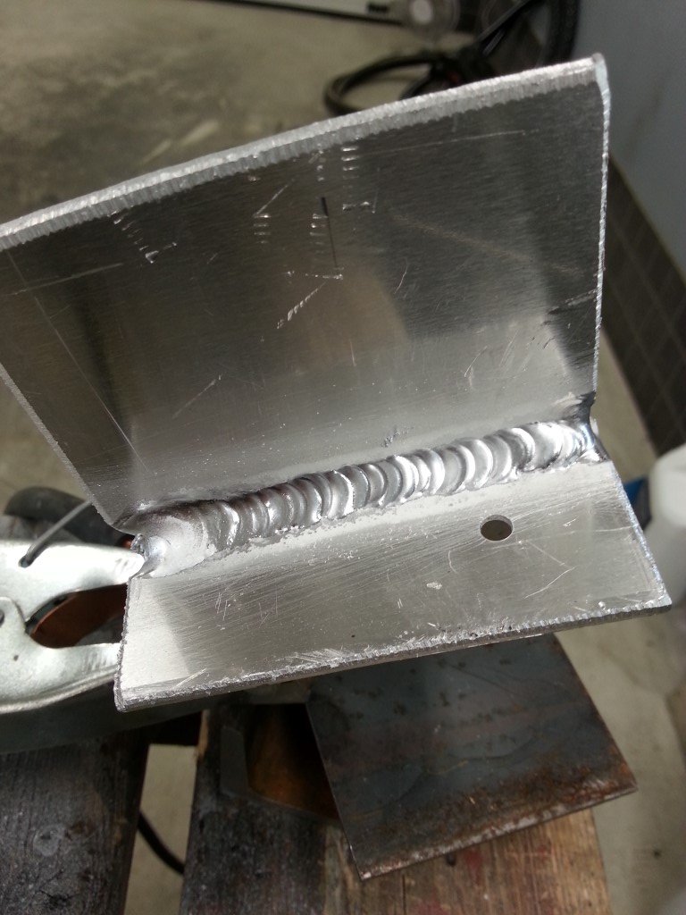 Hieman opetellut iltaisin tigin käyttöä. RST onnistuu kivasti. Alumiini tuottaa hieman päänvaivaa. Pienellä virralla on vaikea saada "lammikkoa" muodostumaan alumiiniin. Isolla virralla lähtö onnistuu taas kivasti mutta loppu sauma on liian kuuma. Putsaan osat porakoneella missä RST harja. Osan ja lisäaineen pyyhin asetonilla. Parametrit kuvan tulokseen: Levy 4mm, ~80-90A virta, 70%, valkoinen 2,4mm elektrodi, aloitus- ja lopetus ramppi ~2s, esi- ja jälkikaasu 2s, 100Hz, nappi kolvi ei pedaalia.