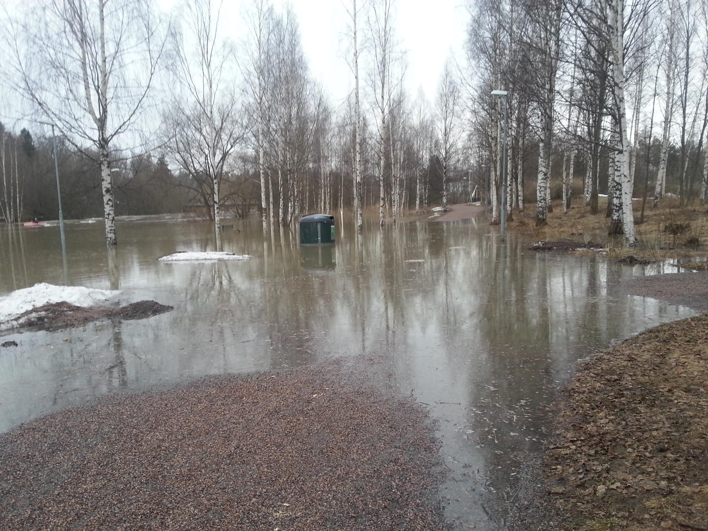 Normaalitasosta sen verran, että ei tuota vasemmalla koivun takana näkyvää valopylvästä ole veteen pystytetty ja roskiksesta kello kymmeneen näkyy penkin selkänoja. Sattuipa kuvaan myös ensimmäinen näkemäni meloja tälle kevättä.
