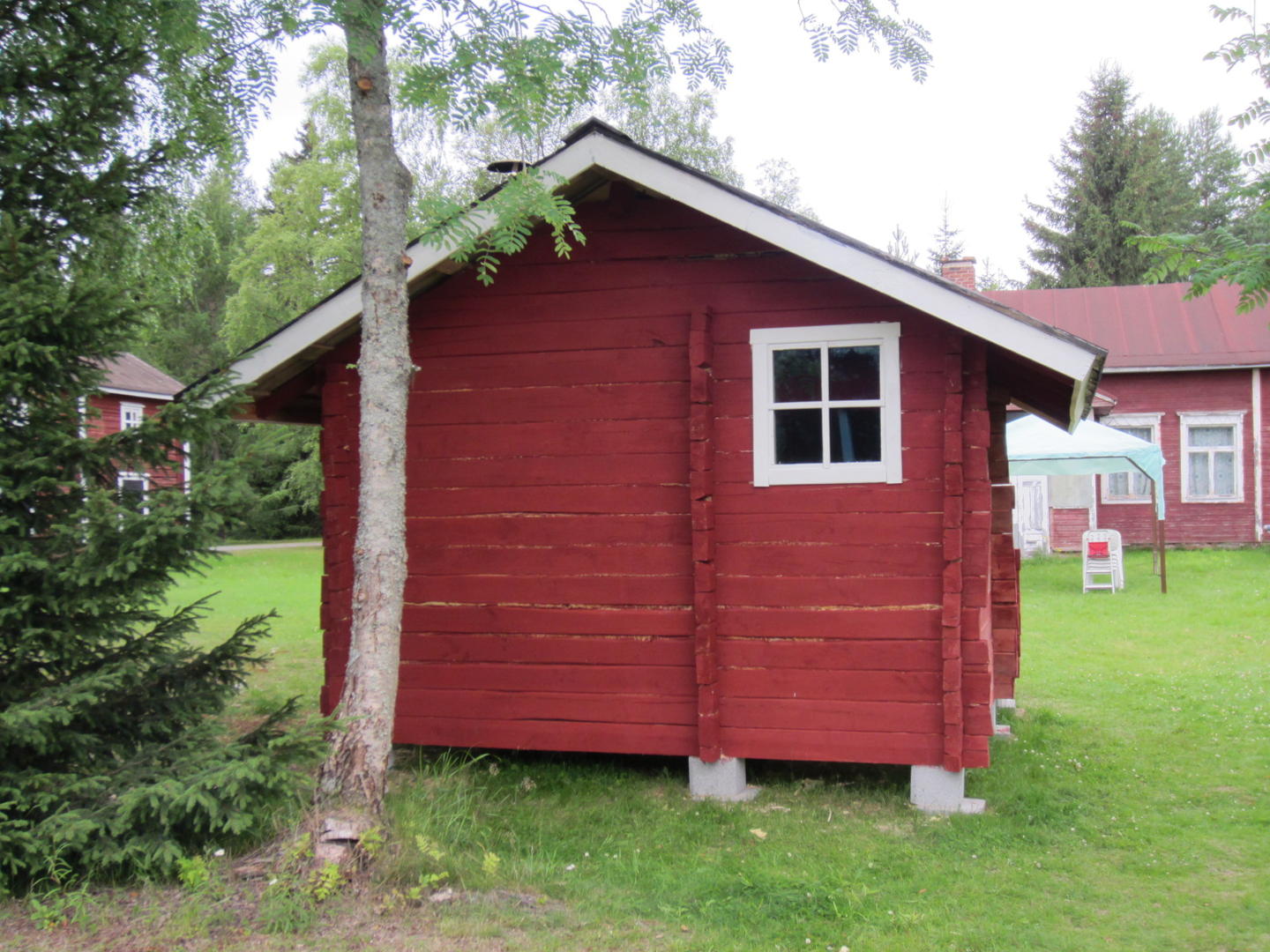• Pihasauna on vihdoin valmis myös ulkopuolelta. :) Jännästi imaisi toisella sivulla tuon maalin tuonne hirren sisään kun jäi noin vaaleaksi verrattuna muihin seiniin. No, eno aikoi maalata sen uudestaan. Nuo vaaleat raidat ovat villaa. Kuistin laudat jäivät vielä vähän vaiheeseen kun terva loppui hiukan kesken. Kulmapilarit laitetaan paikoilleen sitten kun on painunut vähän aikaa.