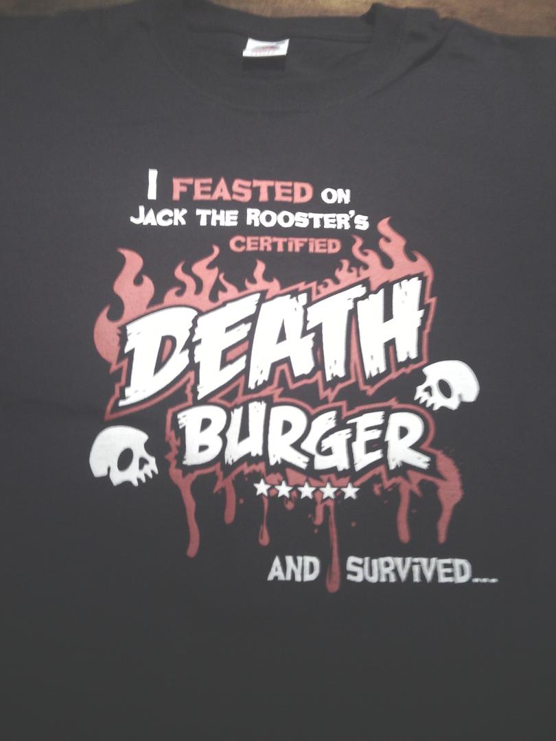 Kävin tänään Tampereella syömässä Jack the Rooster:issa ja vetäisin paljon mainostetun Death Burgerin! Sain nimen listaan ja asiaan kuuluvan T-paidan.