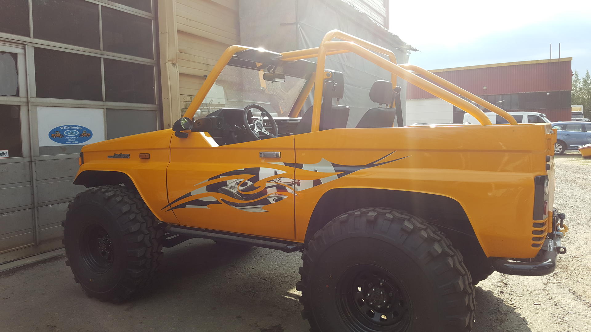 • Isäukon leluhan toi on, mutta mullakin on käyttöoikeus. Joo siis LJ:hän toi on, mutta 400 cid pikkulohko pellin alla. Vanhaan hyvään aikaan tehty että otteessa on mm. V8 moottori, akselit, 38" renkaat...