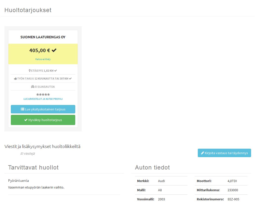 Tämä uusi siis 3h työtä á 55eur+ laakeri 240 eur... tarjous oli mielestäni vähemmän edullinen. Onko muilla kokemuksia?