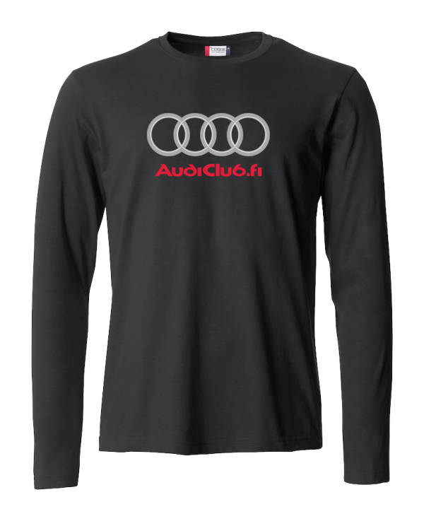 Musta, O-aukkoinen pääntie. 100 % puuvillaa Iso AudiClub -painatus edessä